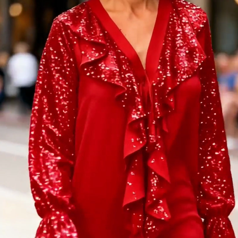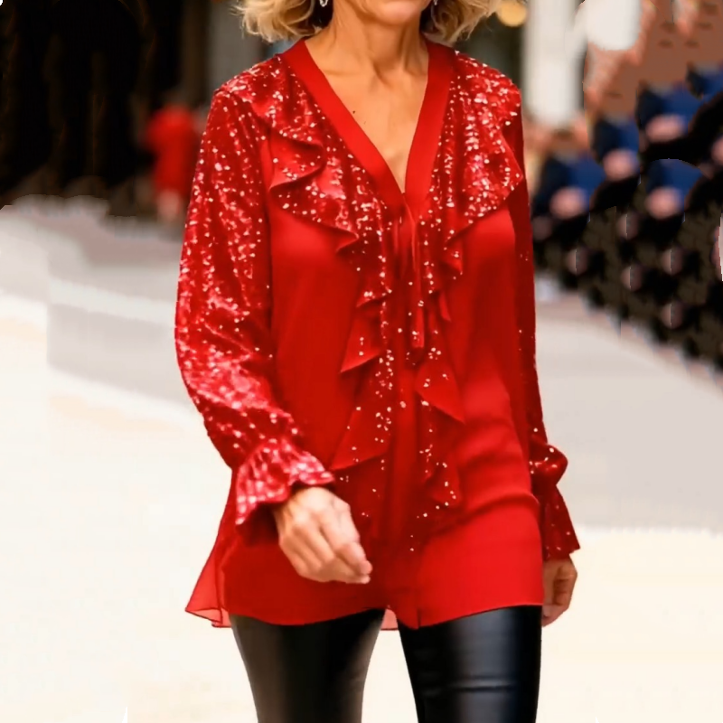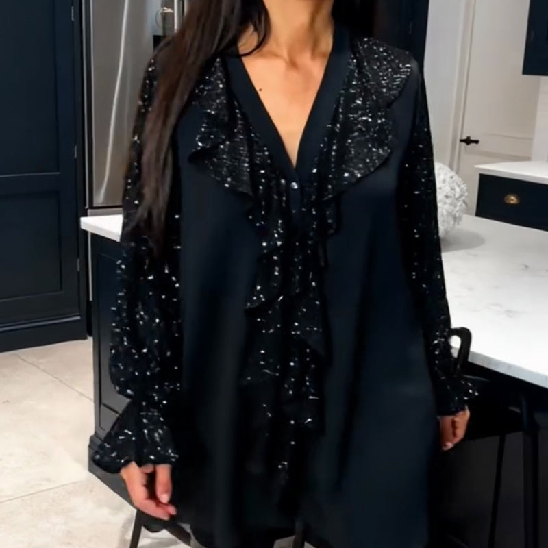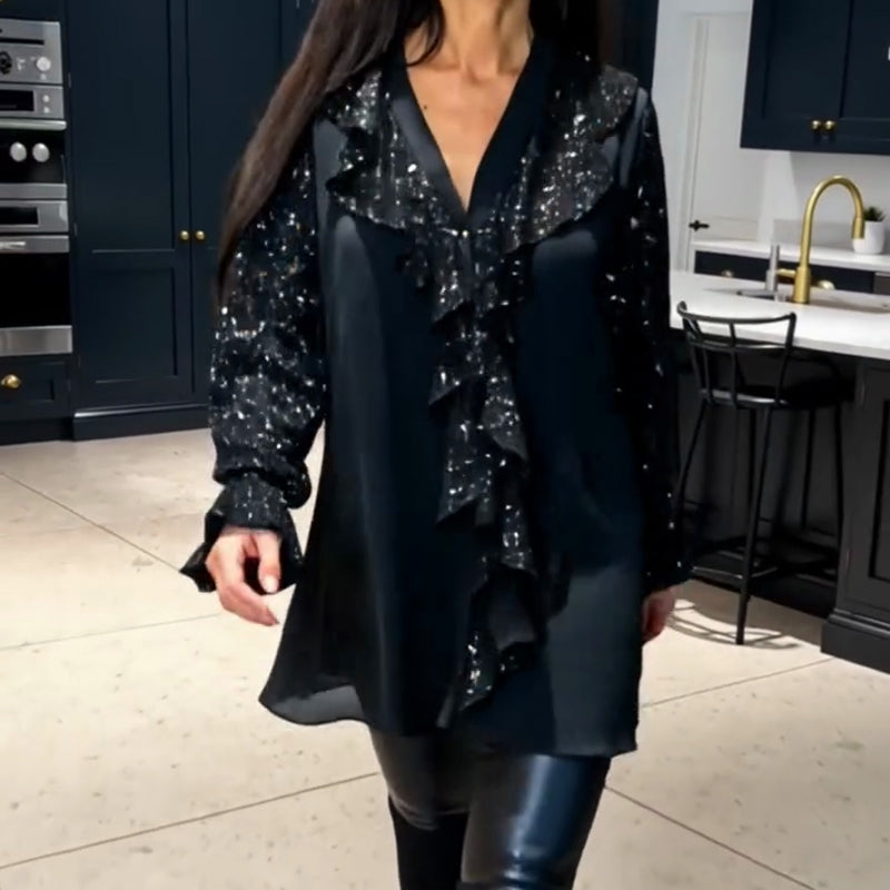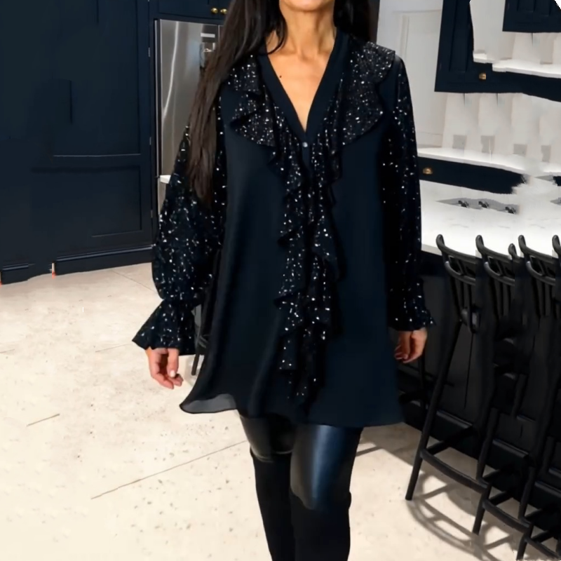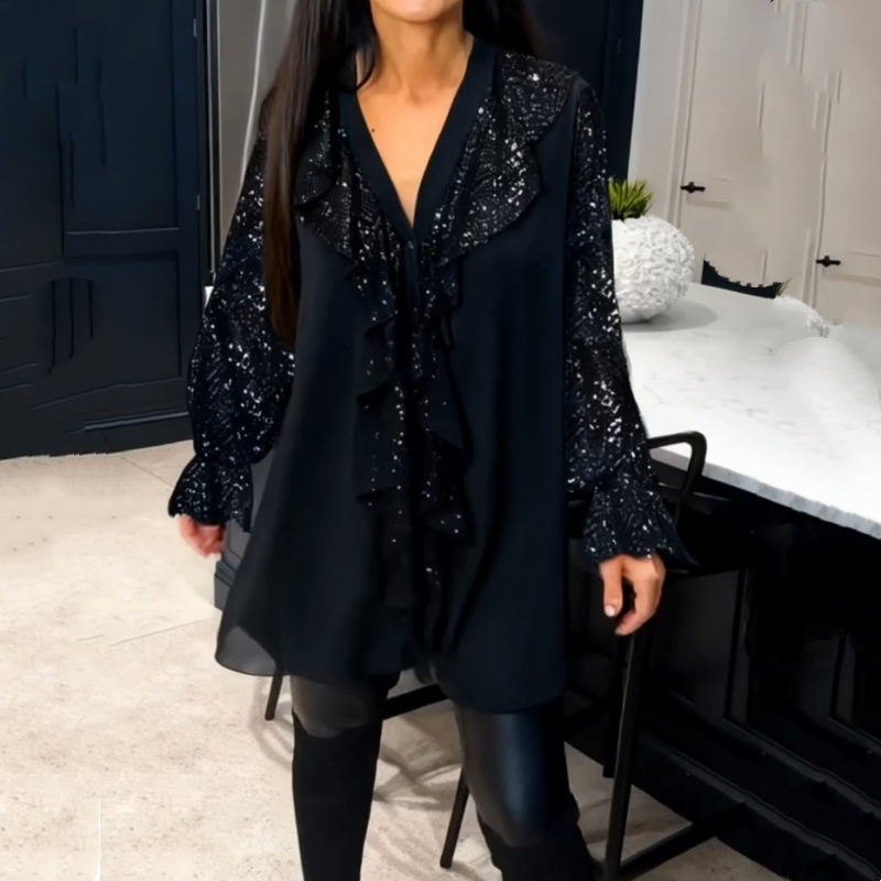 Damtröja med V-ringning, paljetter och volangkant