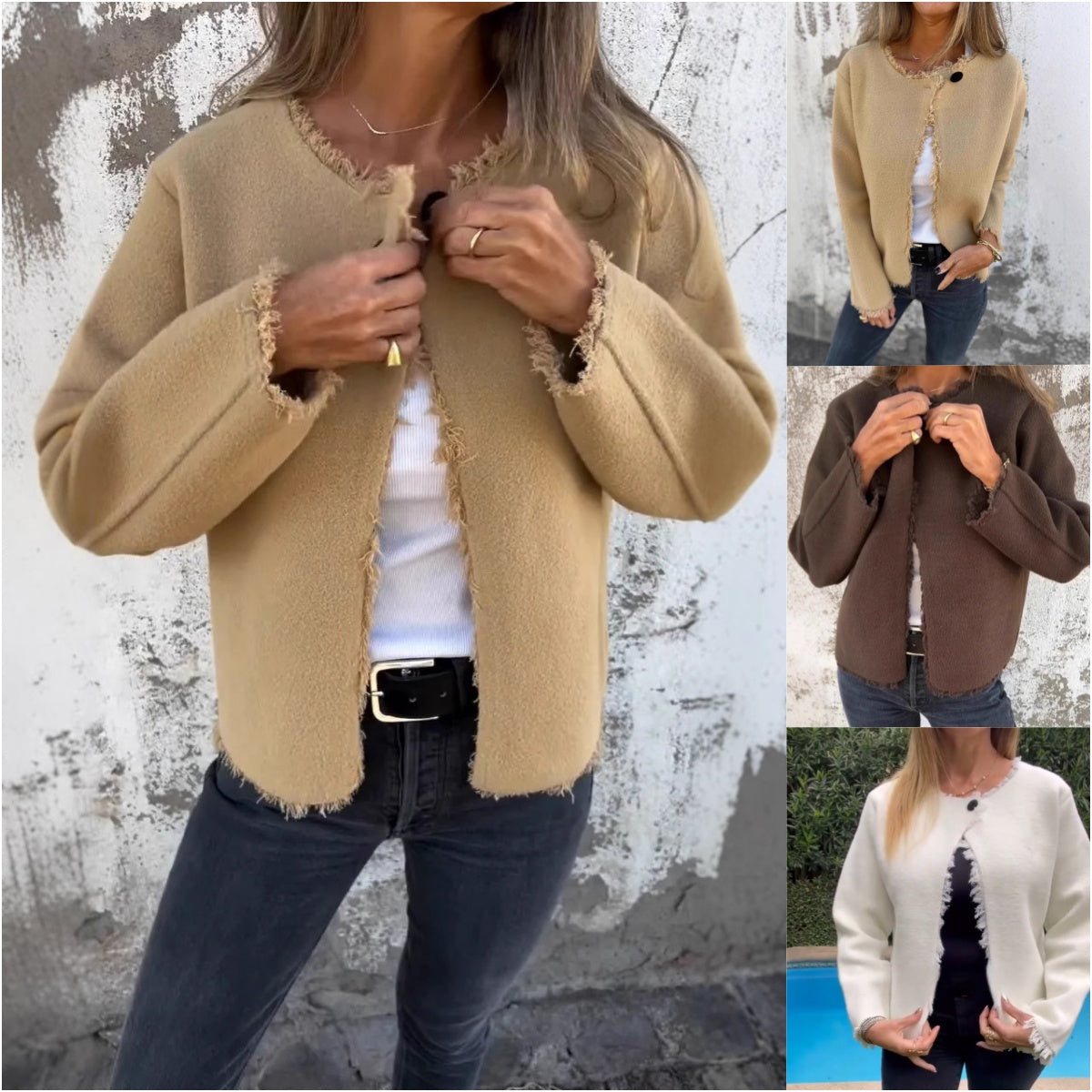 DEKORATIVA FRANSIGA KANTER FÖR EN TRENDIG LOOK: Jackan är designad med fransiga kanter vid ärmslut, halsringning och öppning, vilket ger en elegant, strukturerad detalj som förstärker den avslappnade men ändå eleganta looken för alla tillfällen.