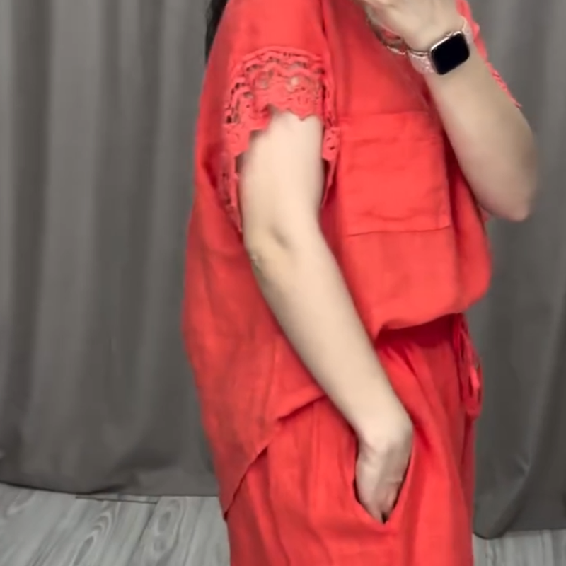 Premium bomull linne spets mudd kortärmad topp och byxor med dragsko Casual set
