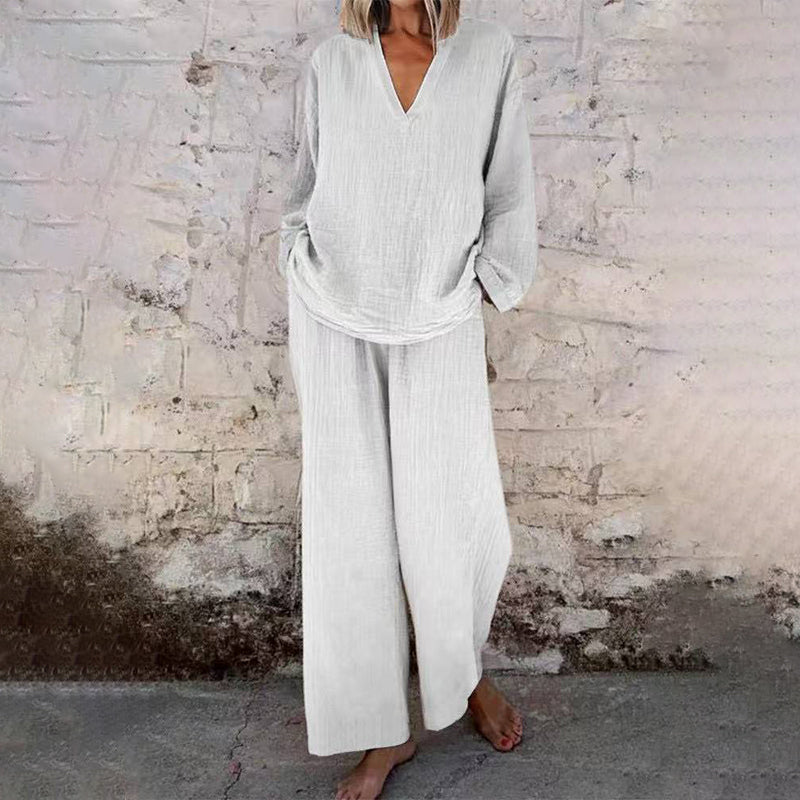 LITE RYNK, LÖS OCH CASUAL - Den V-ringade långärmade toppen och byxorna med vida ben har lätta rynkor som ger en naturligt draperad look. Med sin lösa passform är denna outfit utformad för att passa olika kroppstyper och erbjuder komfort och en enkelt avslappnad stil.