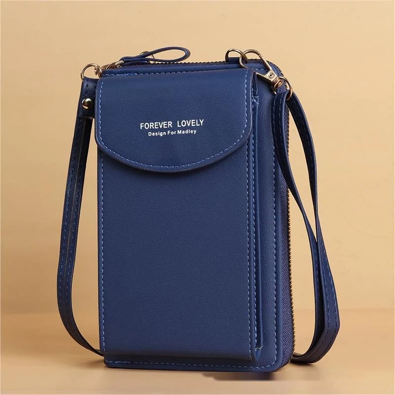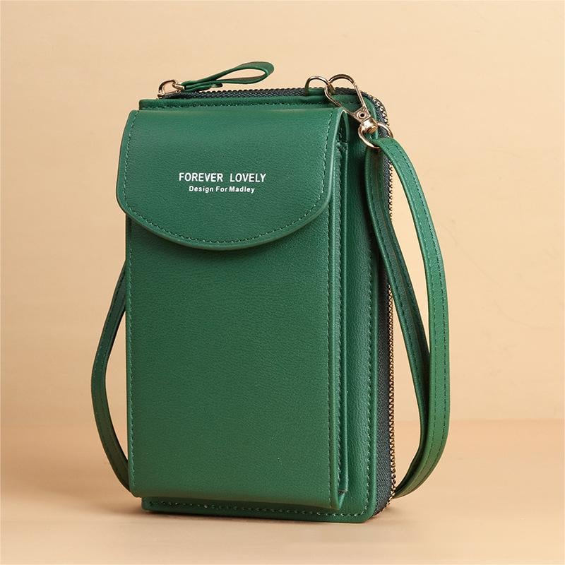 Den har plats för dina kort, kontanter, glasögon, nycklar, pass och mycket mer. Den har ocksÄ en extern ficka med en praktisk tryckknapp, dÀr du kan förvara din mobiltelefon pÄ ett sÀkert sÀtt.