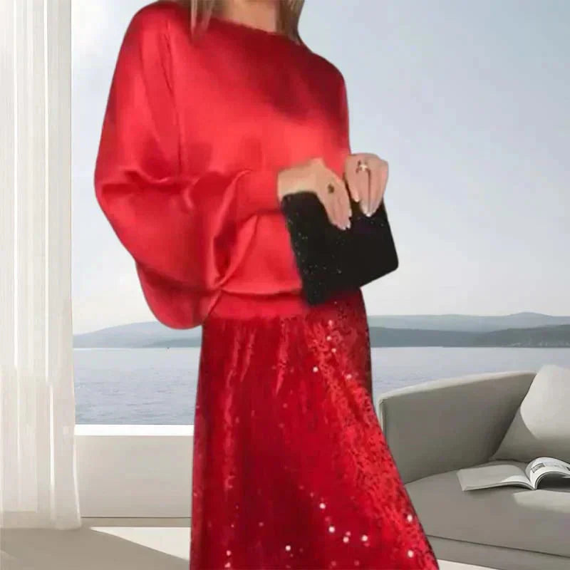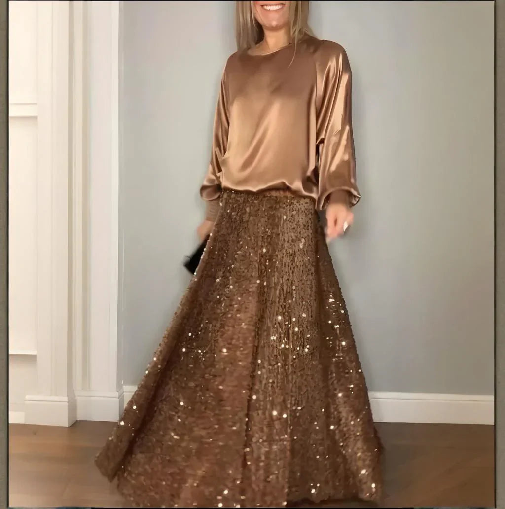 Tvådelat set med långärmad topp och långkjol med paljetter för kvinnor