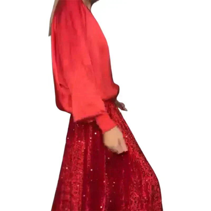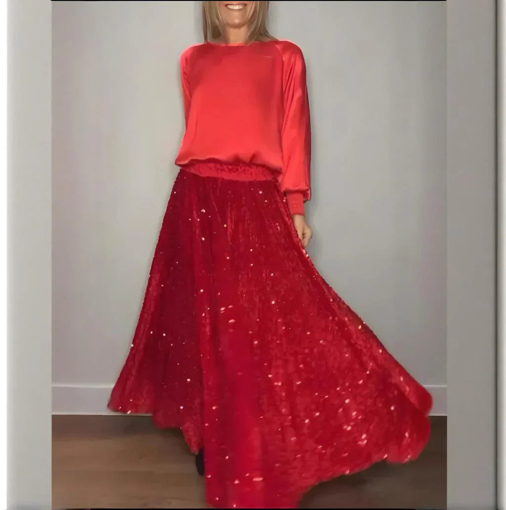 Paketet innehåller:1*Långärmad topp för kvinnor och tvådelat set med paljett-maxikjol