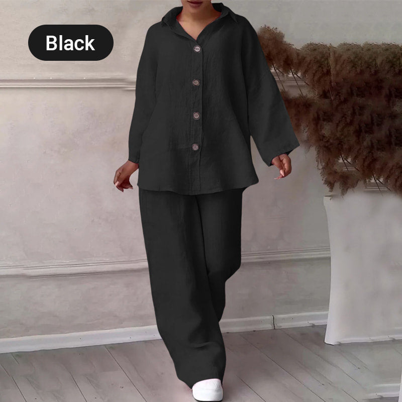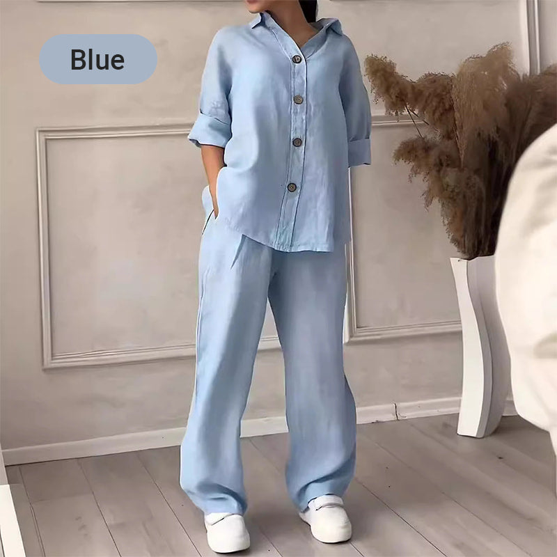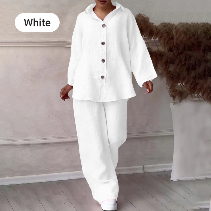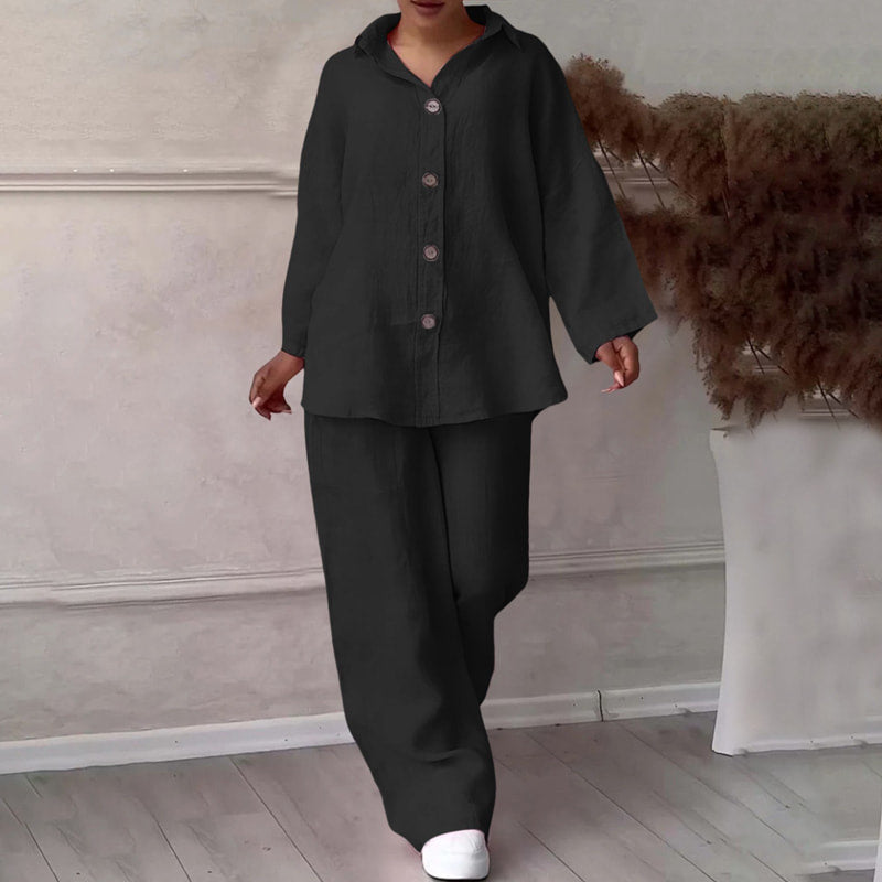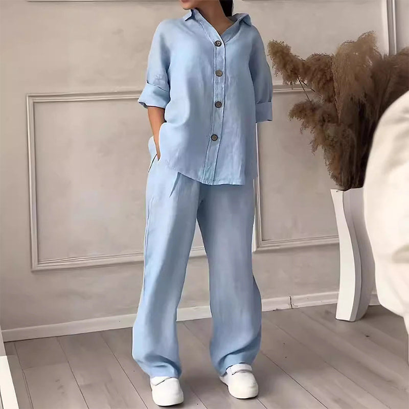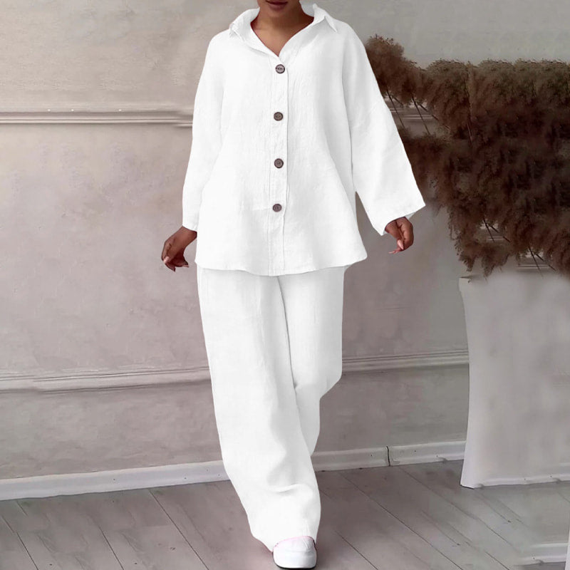 Skjorta med långa ärmar och kavajslag och byxor med vida ben Tvådelat set i bomull och linne