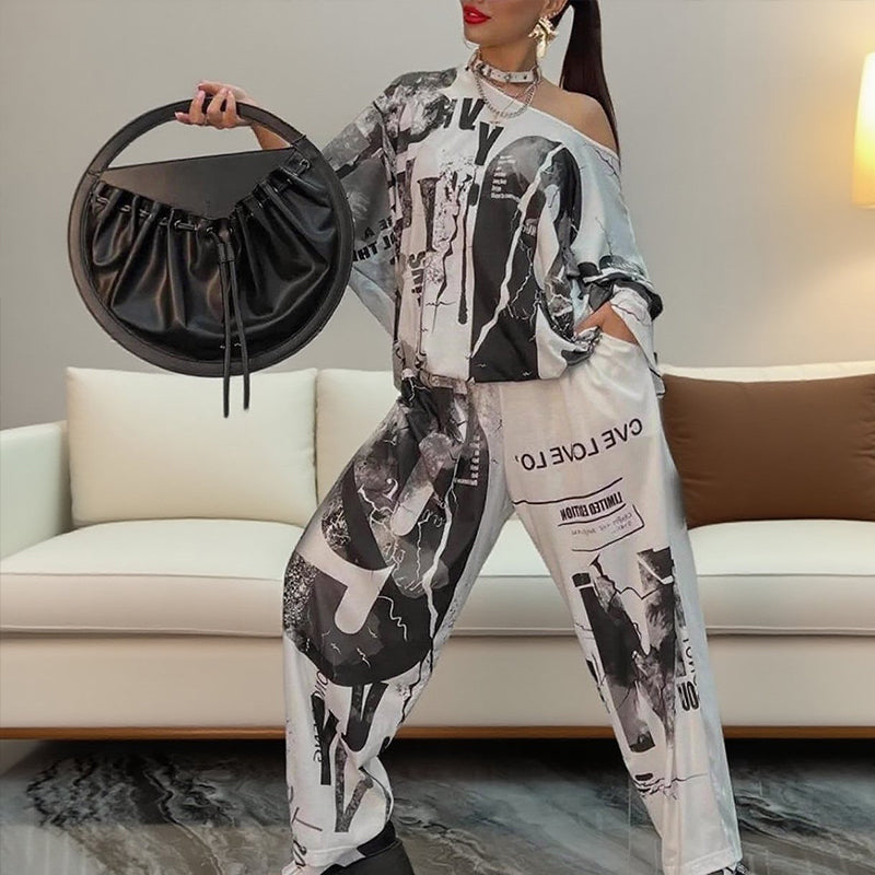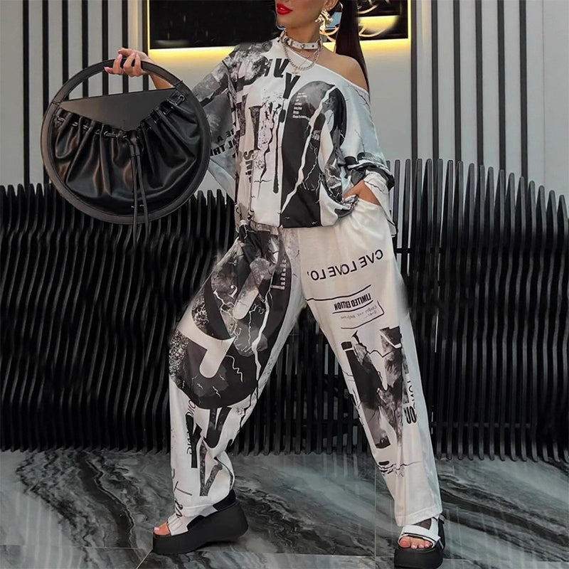 Moderiktigt tvådelat set för damer bestående av topp och byxor