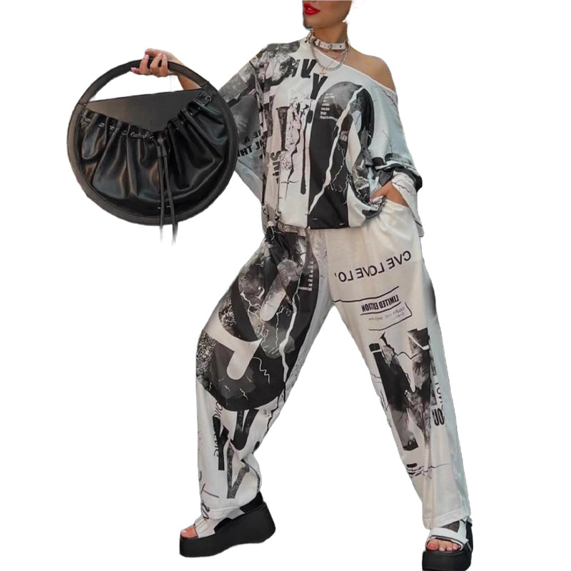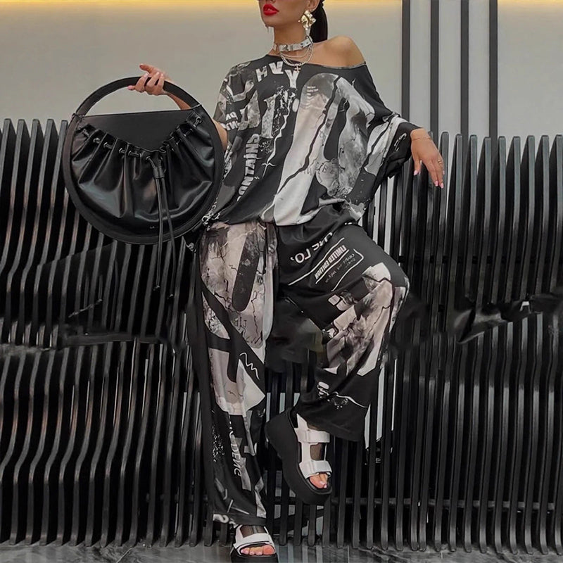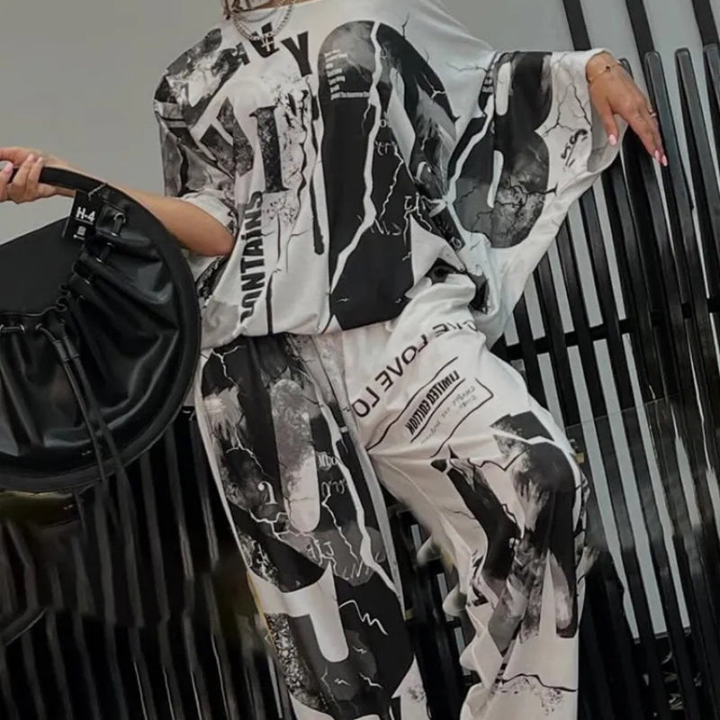 BÄRBAR KONST SOM TALAR BAND - Det iögonfallande abstrakta trycket kombinerar grafiska linjer, djärva bokstäver och geometriska former för att skapa en modern look. Det är mer än bara ett mönster - det är ett bärbart statement för kvinnor som älskar kreativitet och vill sticka ut med självförtroende.