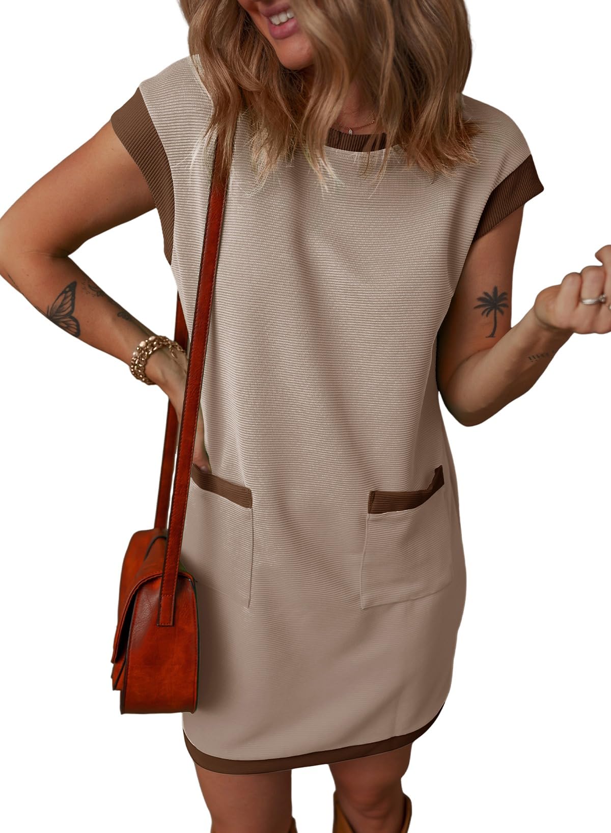 Avslappnad T-shirt klänning för kvinnor med korta ärmar och färgblock med fickor