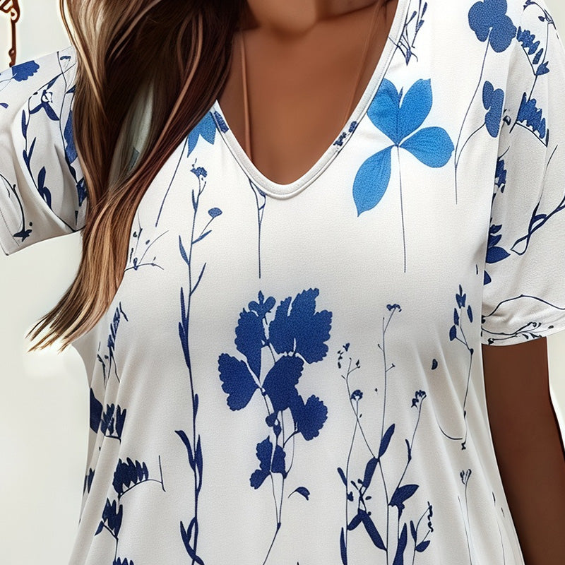 Avslappnat blommigt tryck för kvinnor med korta ärmar