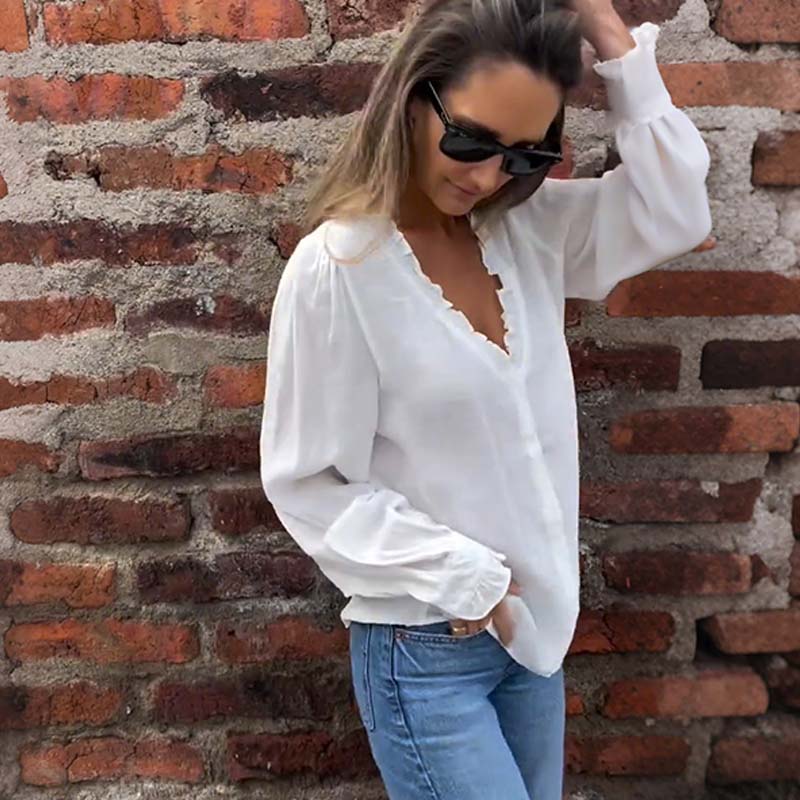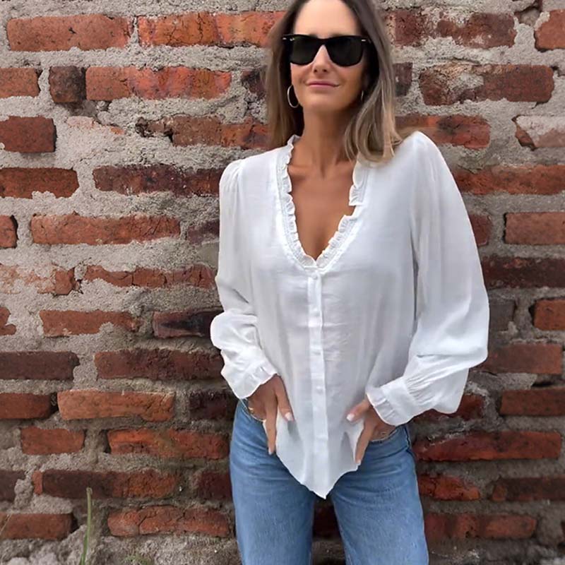 DELIKATA VOLANGER – Diskreta volanger längs halsringningen och ärmsluten ger en romantisk, feminin charm. Dessa delikata detaljer lyfter den klassiska skjortdesignen och gör den till ett utmärkande plagg i din garderob.