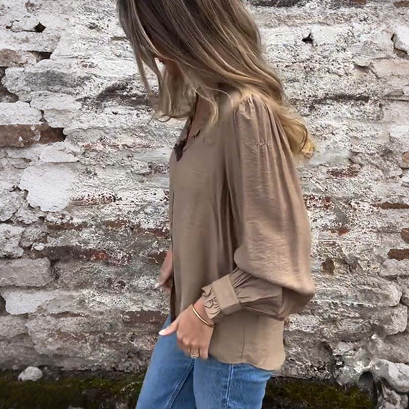 CHIC PUFFÄRMAR – De långa ärmarna är försiktigt rynkade vid axlarna och ärmsluten, vilket skapar en subtil puffeffekt. Denna moderna detalj ger en trendig volym och en mjuk, elegant struktur till din totala look.