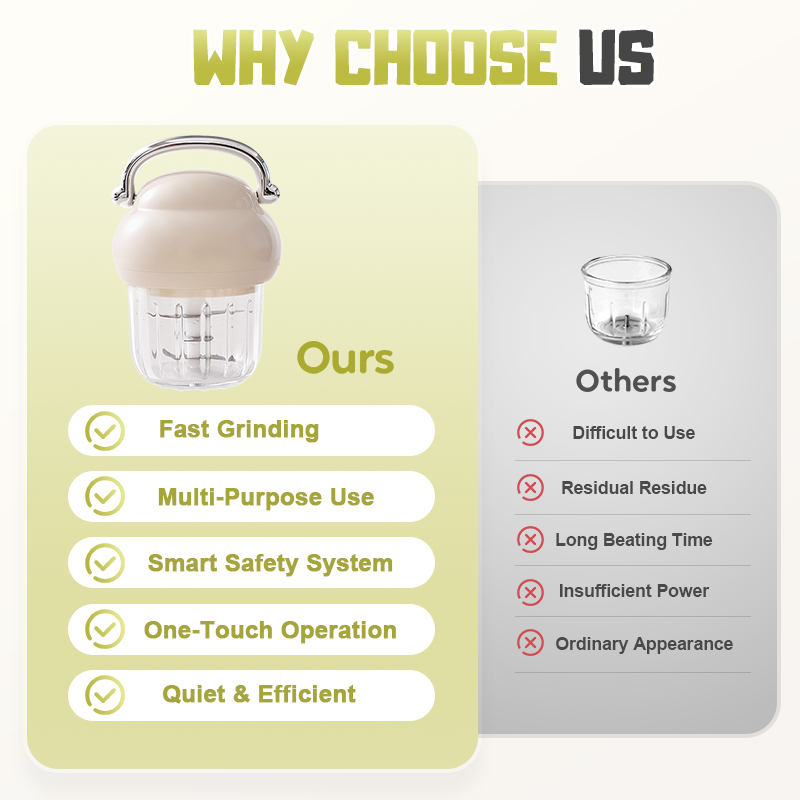 6 KNIVAR & KRAFTFULL MOTOR – Utformad för effektiv malning. De högvarviga knivbladen i rostfritt stål ger resultat på restaurangnivå på bara 30 sekunder. Perfekt för kött, vitlök, barnmat och andra ingredienser – sparar både tid och energi i köket.