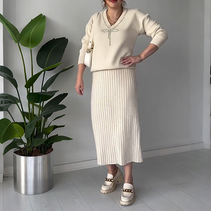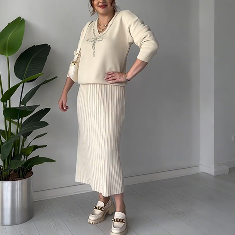 Elegant tvådelat set med tröja och kjol med strassrosett för kvinnor