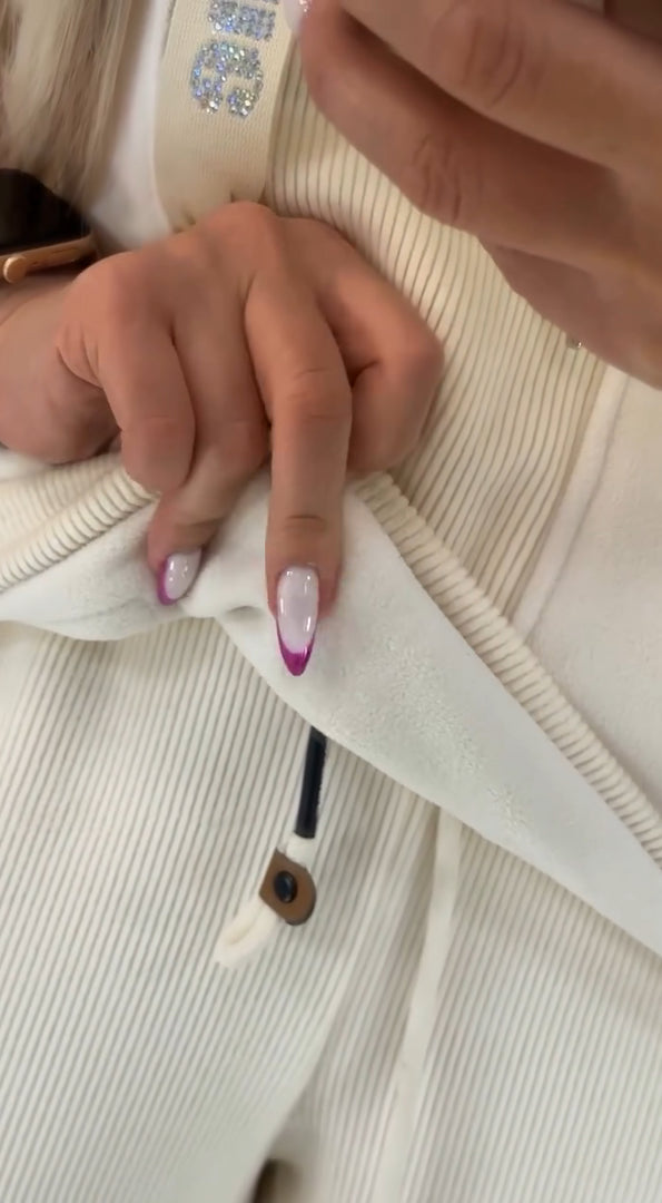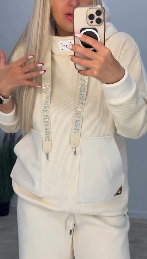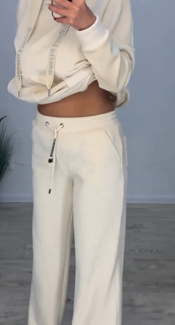 Den löst sittande toppen, i kombination med matchande underdel, skapar en avslappnad men stilren look.