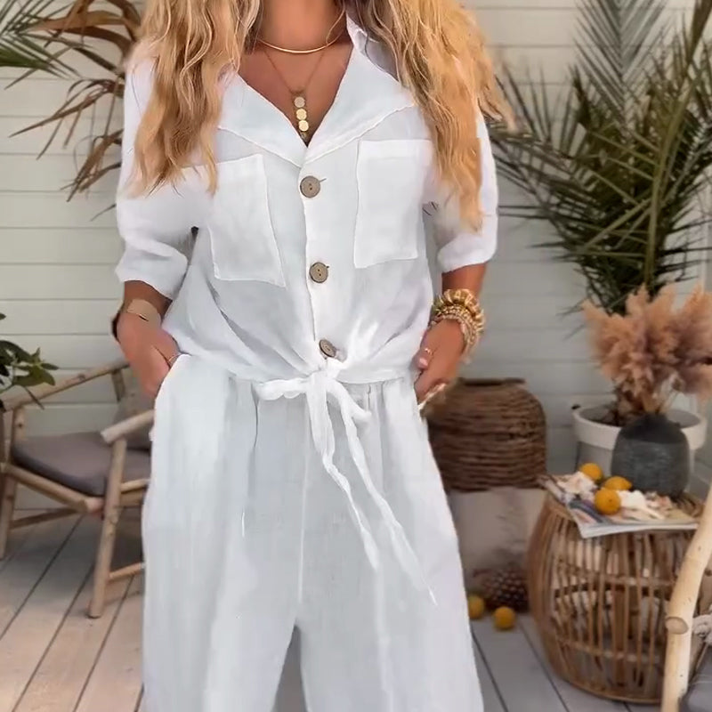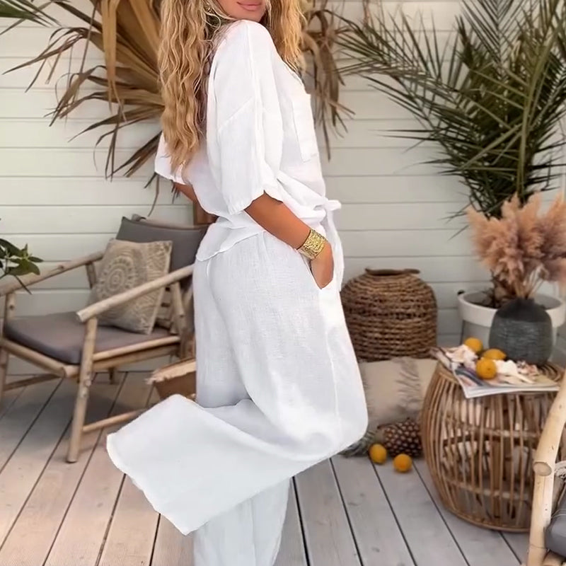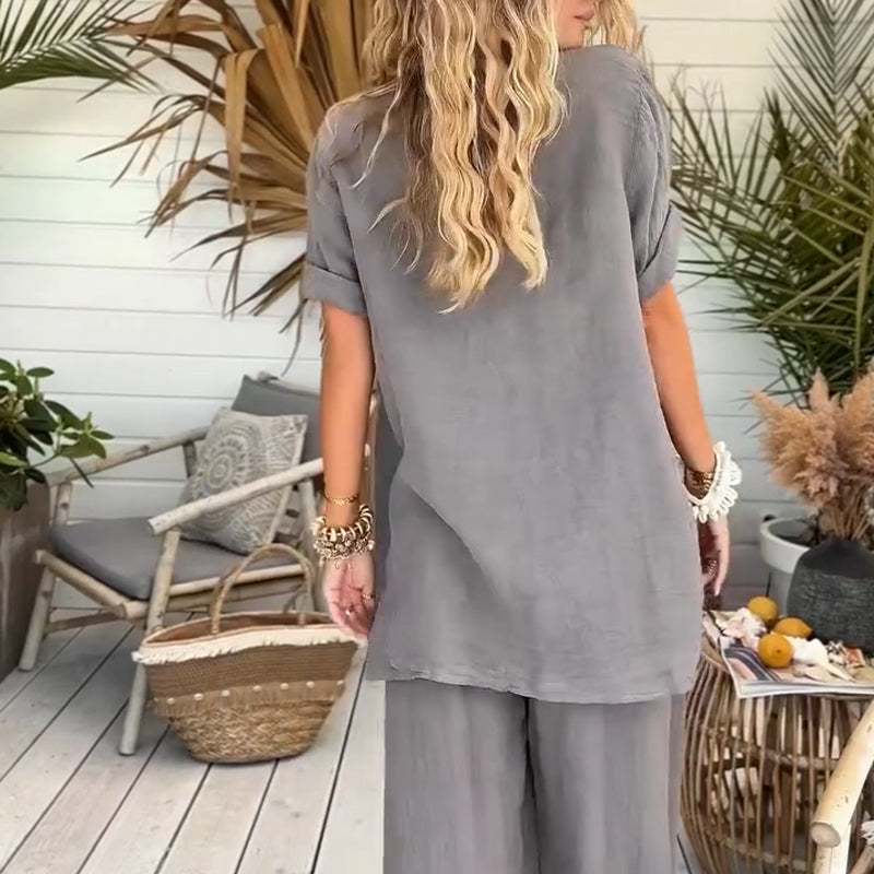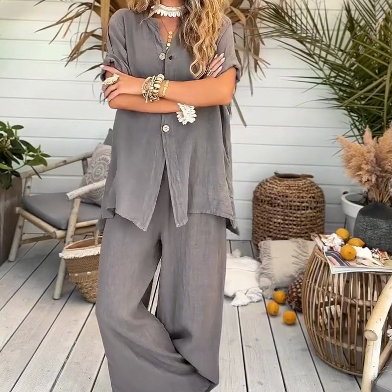 đž50% rabatt pĂ„ nya produkterđ2-delat damset bestĂ„ende av en enfĂ€rgad, lös kortĂ€rmad skjorta och vida byxor