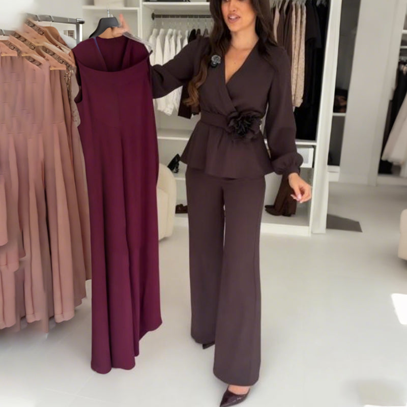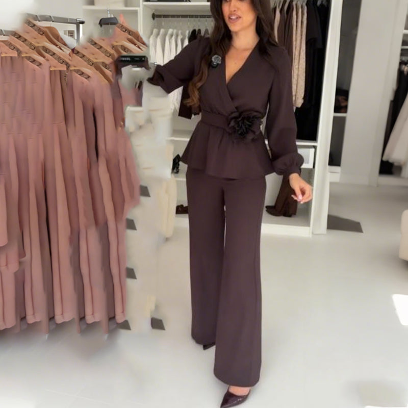 2-delat set med V-ringad topp och raka byxor för damer