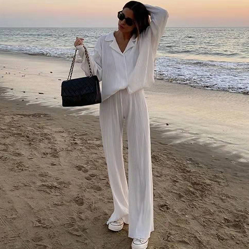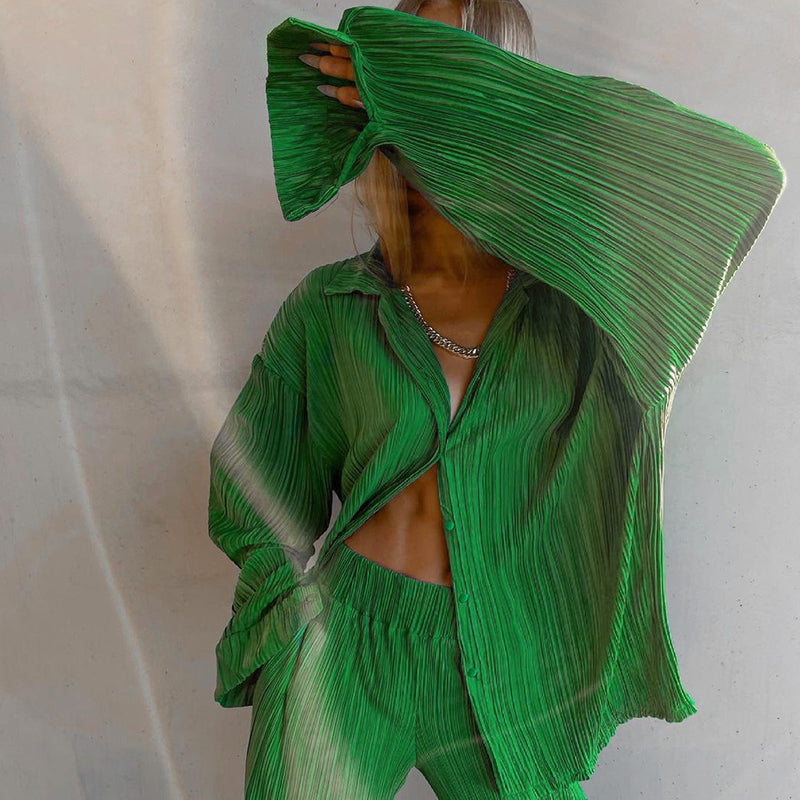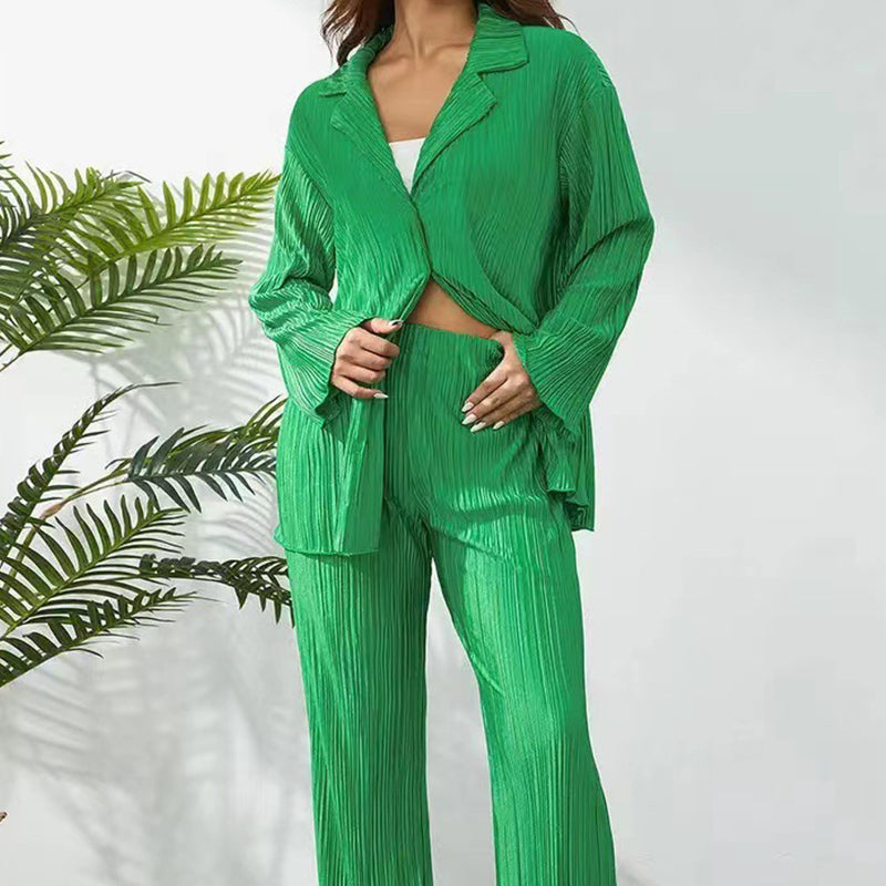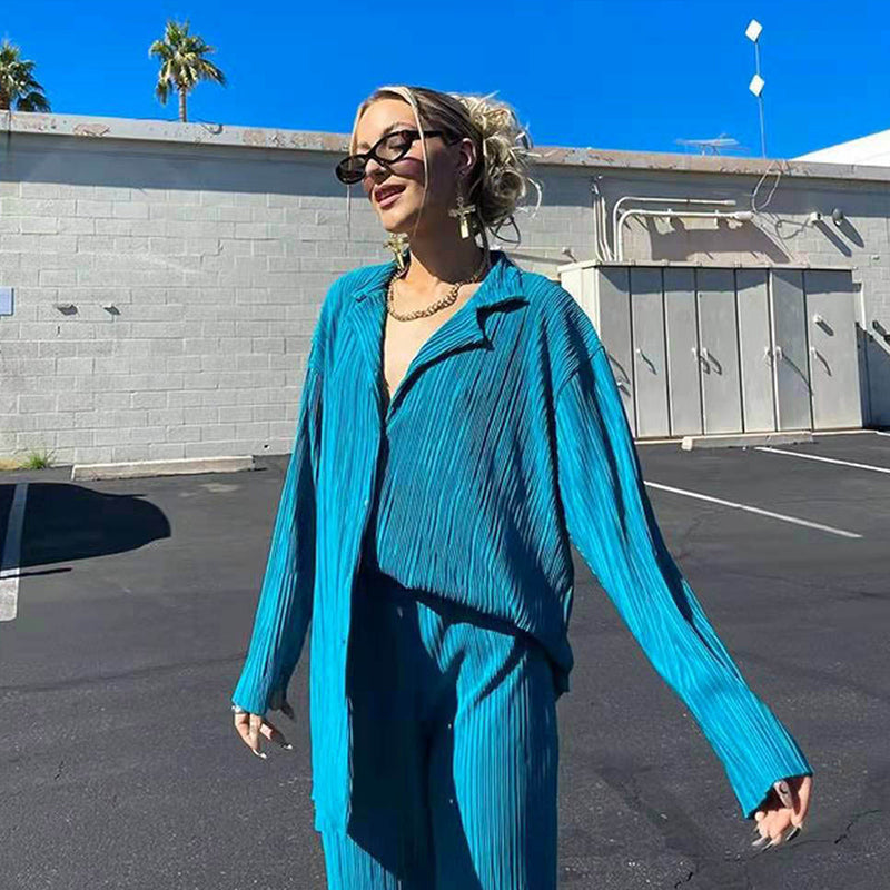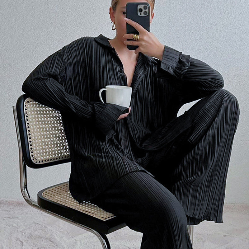 PLISSERAD DESIGN: Den plisserade designen på både skjortan och byxorna ger textur och elegans till din outfit. Det skapar en snygg, tidlös look som är perfekt för alla säsonger.