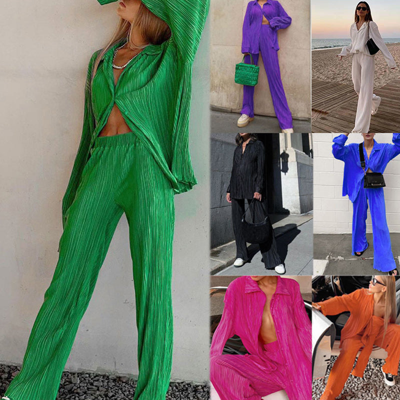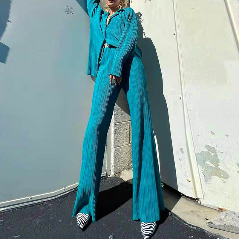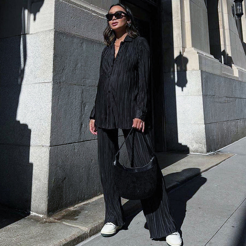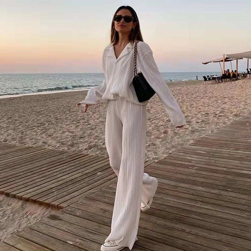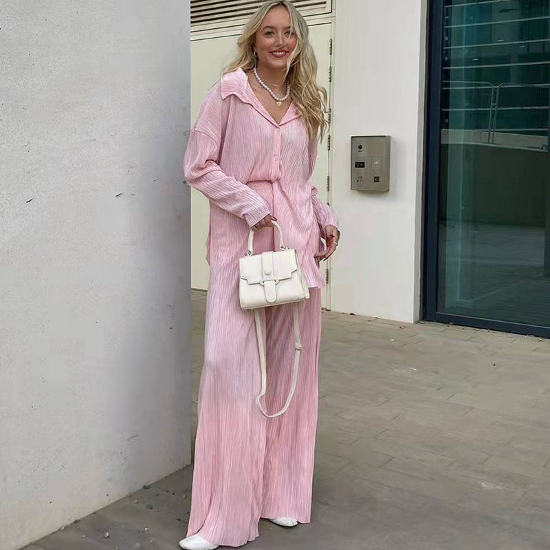 PLISSERAD DESIGN: Den plisserade designen på både skjortan och byxorna ger textur och elegans till din outfit. Det skapar en snygg, tidlös look som är perfekt för alla säsonger.