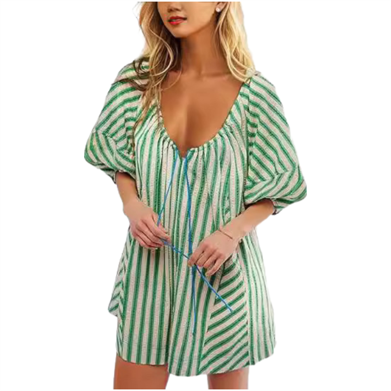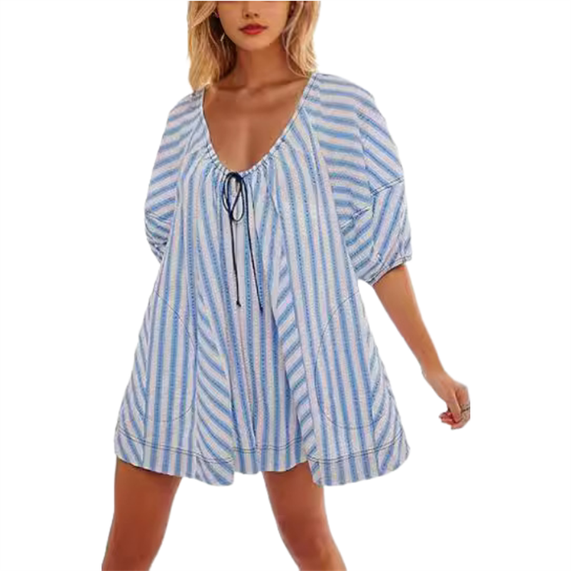 STILIG DESIGN – Designen med låga mättnadsränder i hela kroppen är uppfriskande, och puffärmarna gör att denna överdimensionerade randiga jumpsuit med rund hals ser väldigt söt ut.