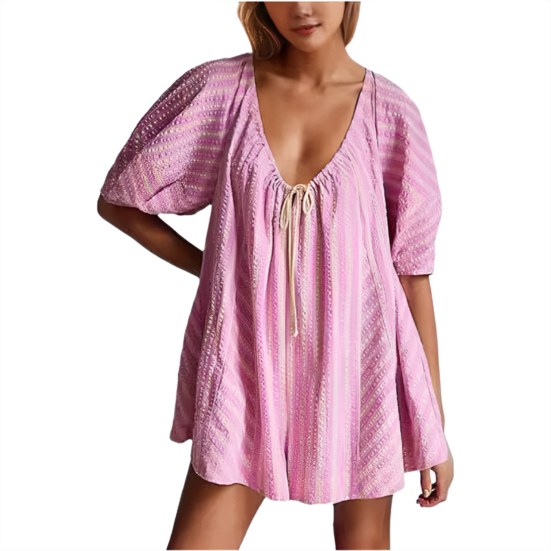 KOMFORTABELT TYG – Denna lösa jumpsuit är tillverkad i mjuk polyester, med en lös passform, låg rund halsringning och puffärmar, vilket säkerställer komfort och lätthet.