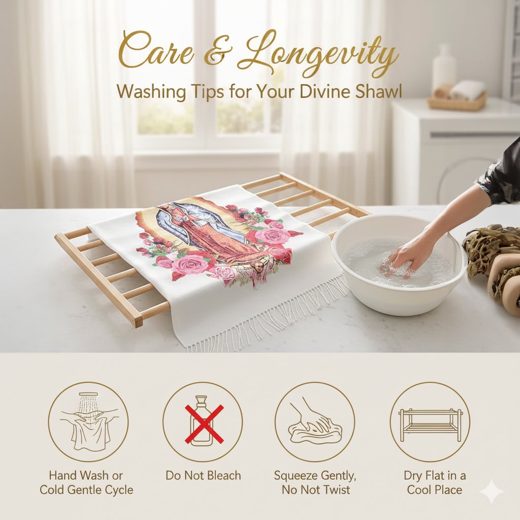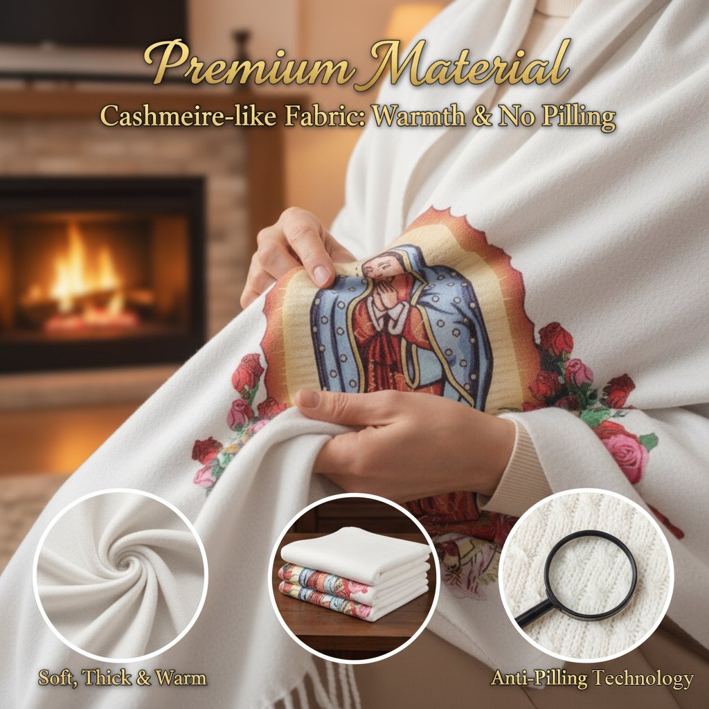 Varje sjal har ett vackert motiv av Jungfru Maria, som symboliserar fred, hopp och gudomligt beskydd. Det är inte bara ett accessoar – det är en daglig påminnelse om tro och tacksamhet under denna heliga tid.