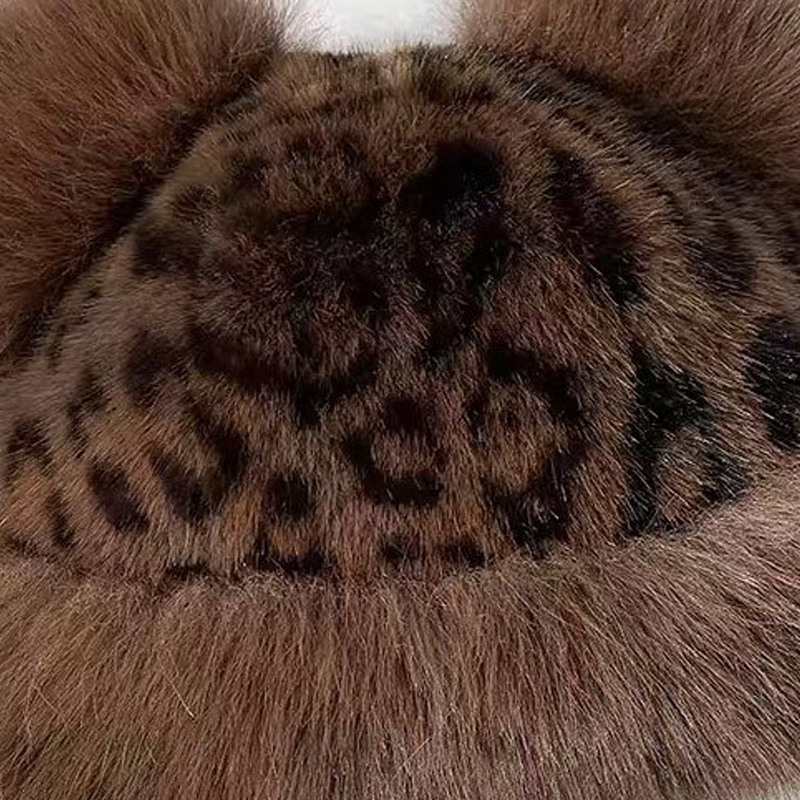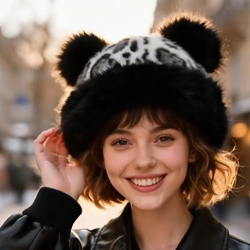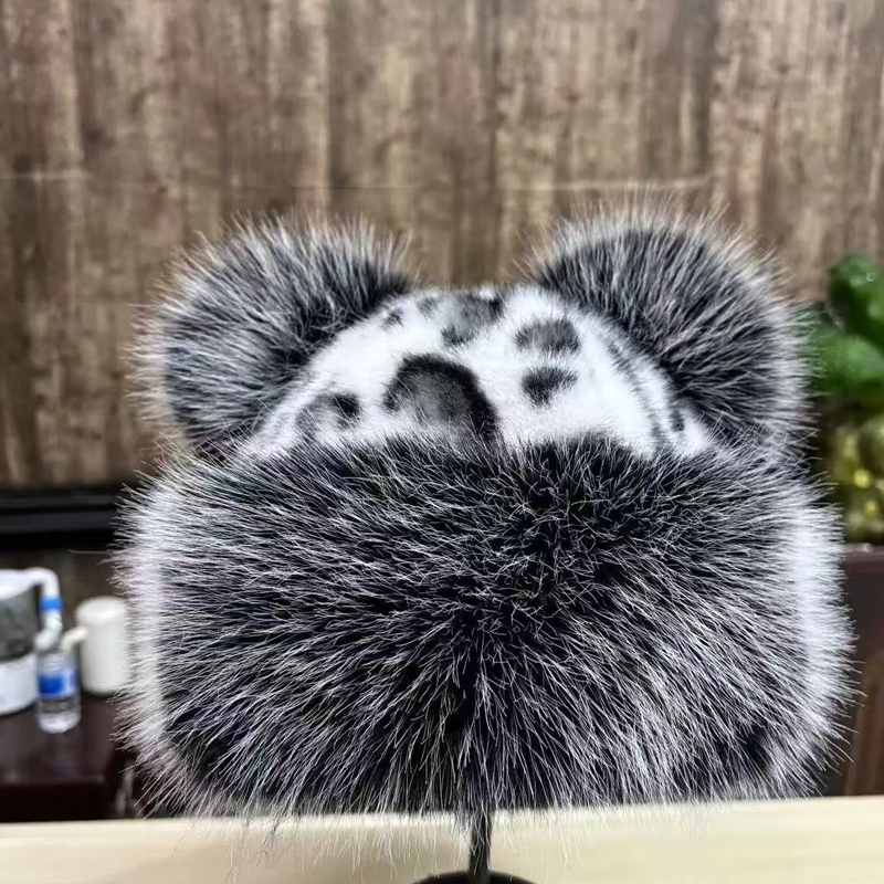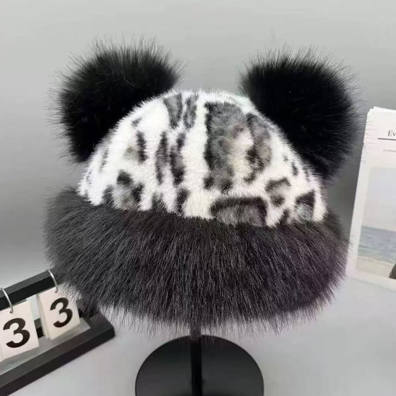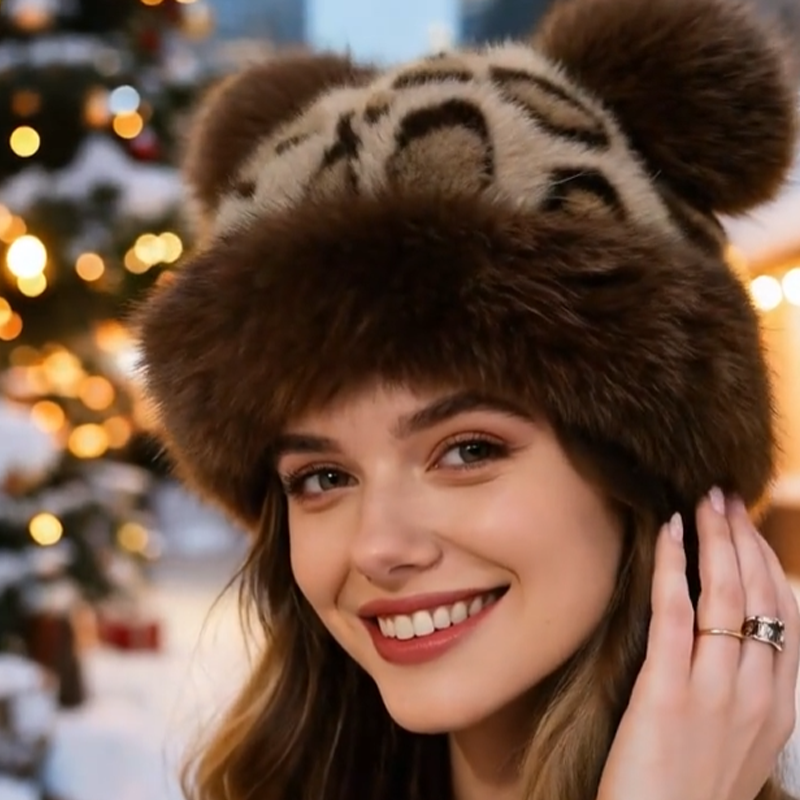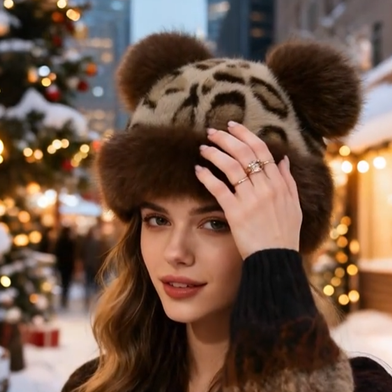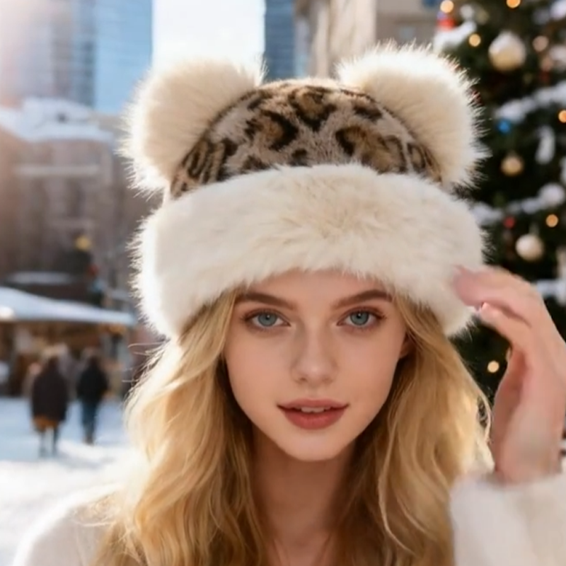 Retro leopardmönstrad mössa med björnöra för kvinnor