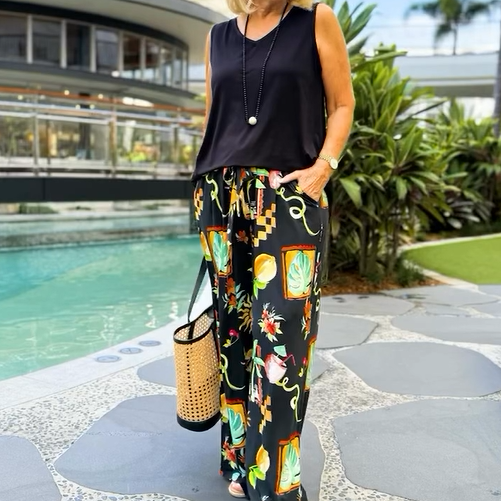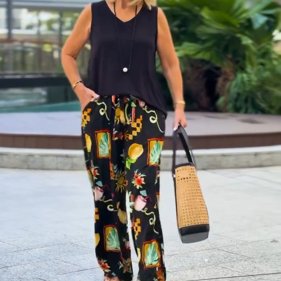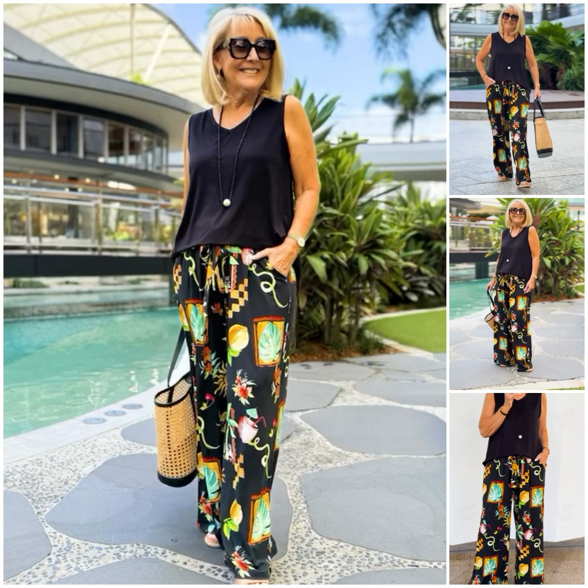 ELEGANT OCH TRENDIG DESIGN: Detta eleganta 2-delade set har en ärmlös topp tillsammans med snygga byxor med vida ben med tryck, perfekt för en enkel men modern look.