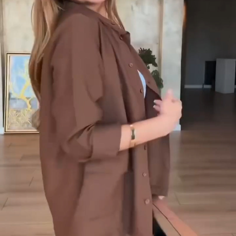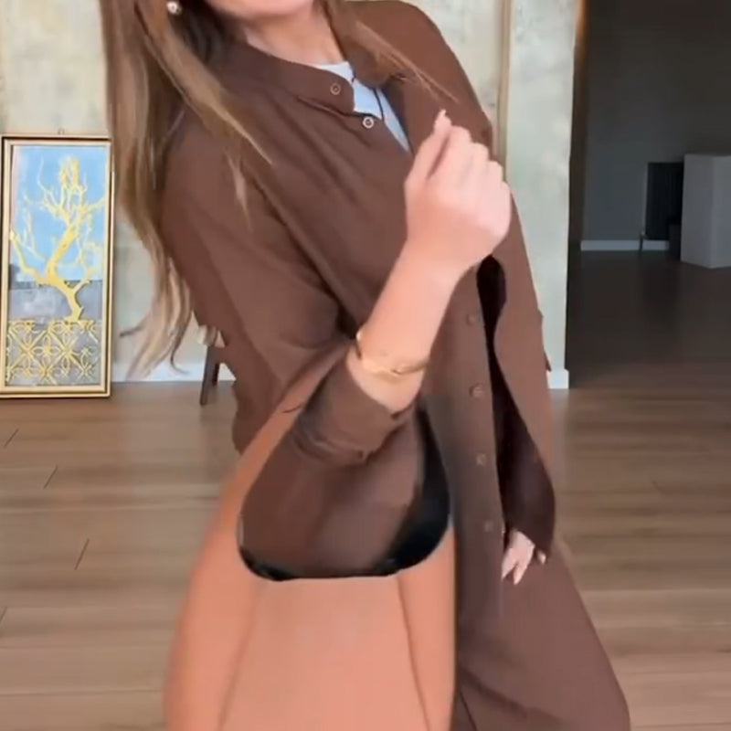 AVSLAPPNAD CHIC STIL: Den minimalistiska enfärgade designen skapar en sofistikerad vardagsstil utan ansträngning. Den avslappnade skjortsilhuetten passar perfekt med byxorna med hög midja för en balanserad, modeinriktad look som sömlöst övergår från arbete till helg.