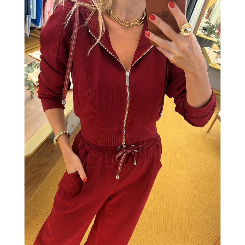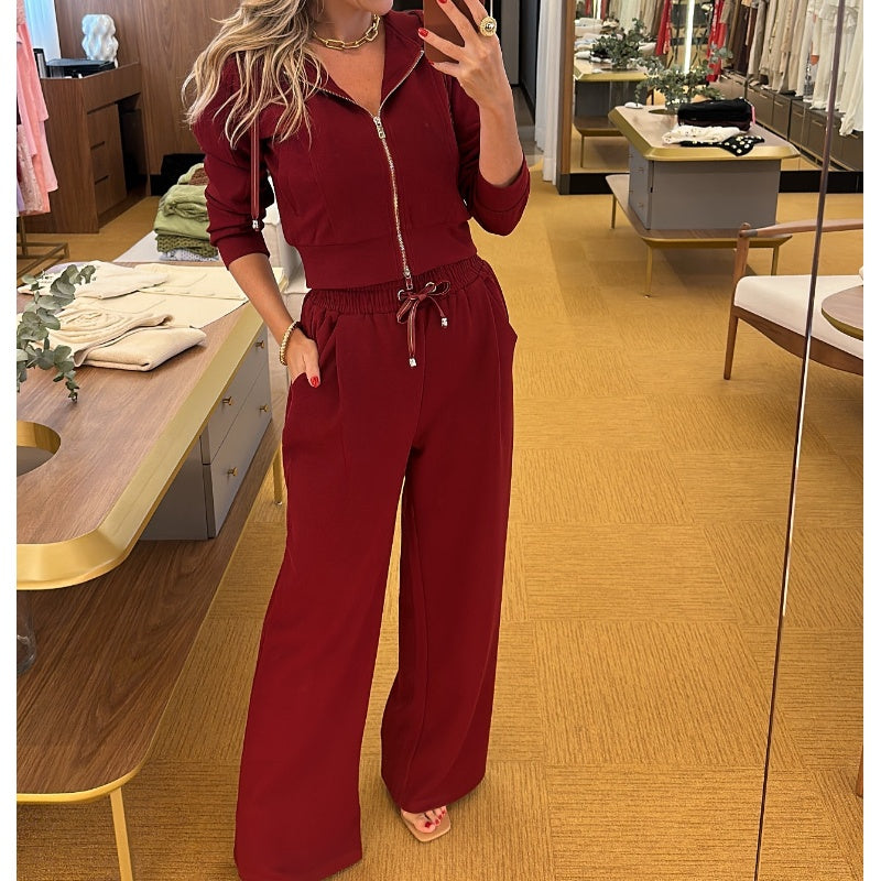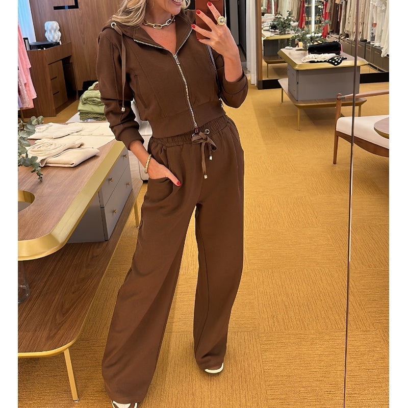 Solid 2-delat set med kort hoodie med dragkedja och byxor med dragsko