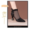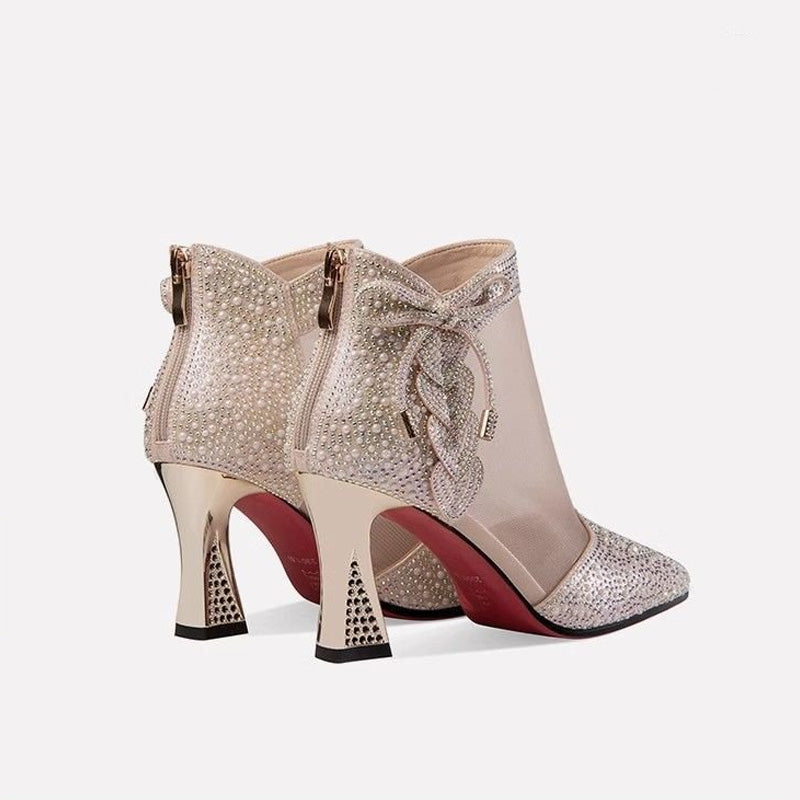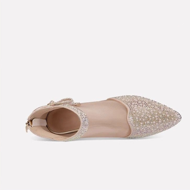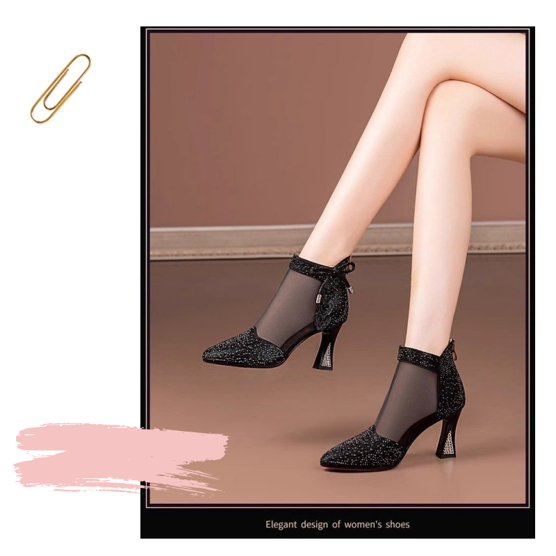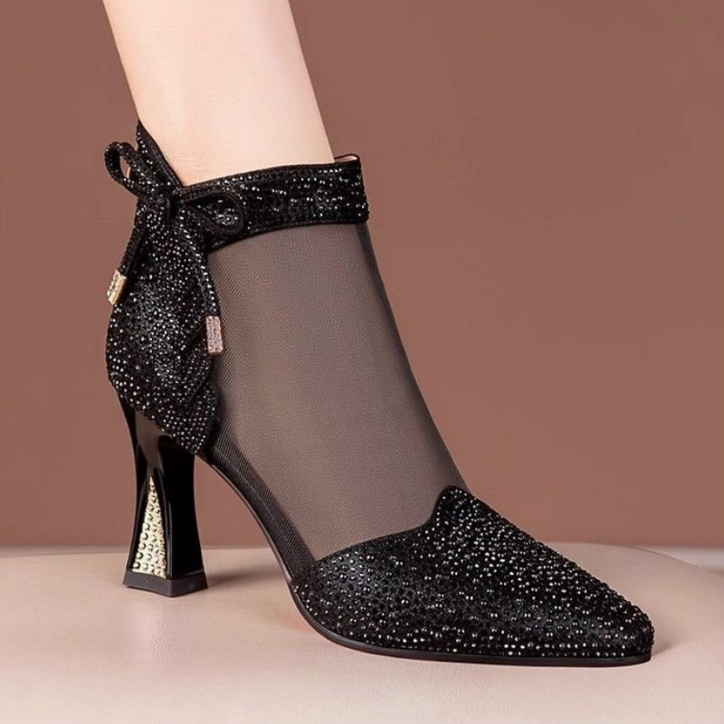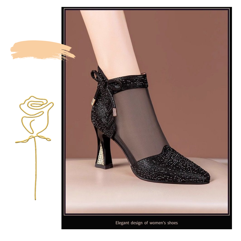 Iögonfallande designelement: Tillverkad med nätpaneler utsmyckade med glittrande strass, utstrålar denna sko en moderiktig touch som förkroppsligar glamour och elegans. Den spetsiga tån och de fina rosettdetaljerna ger en touch av femininitet och sofistikering, vilket gör varje steg till en höjdpunkt.