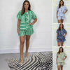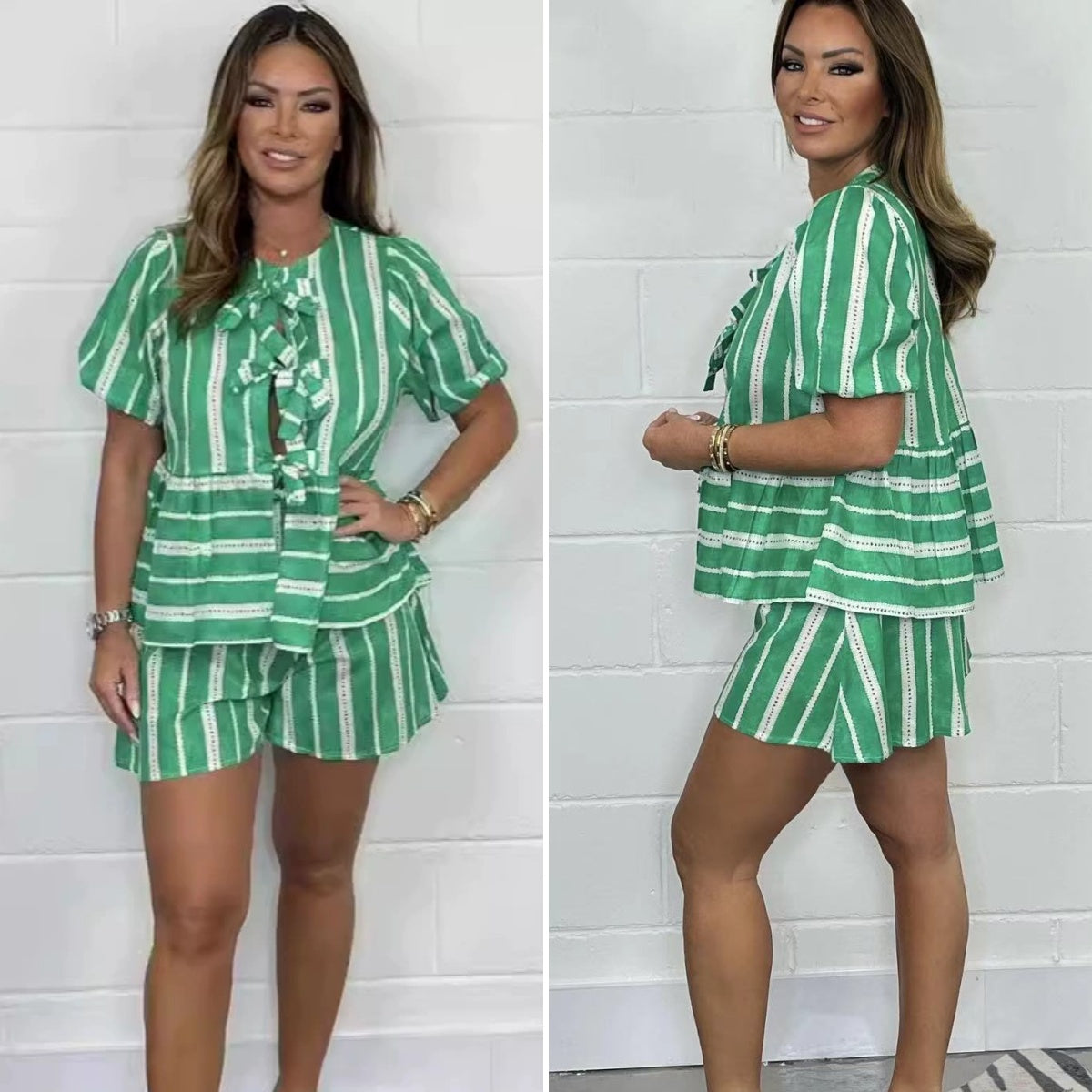 VITA RÄNDER MÖTER BOW TIE CHARM - Krispigt mintgrönt tyg dansar med preppy vita ränder, toppade med en söt bow-tie halsringning. Perfekt för picknick eller stadspromenader, detta set balanserar lekfull elegans med en touch av retro - solsken möter sofistikering.