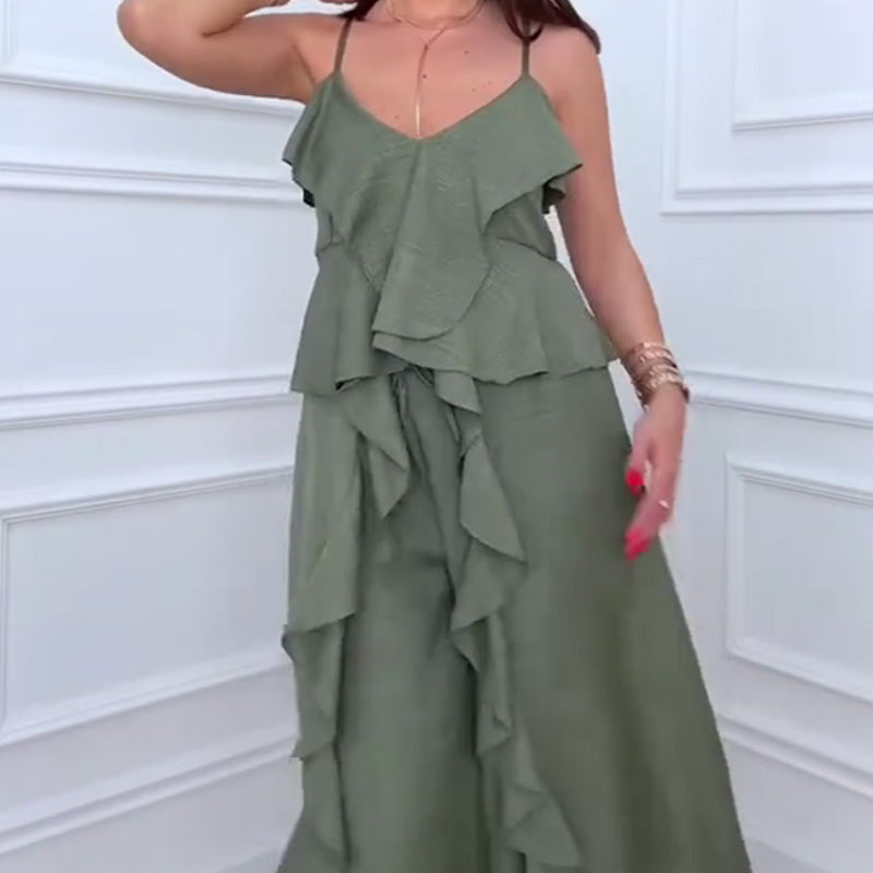 Paketet innehåller: 1 * Women's Fashion Ruffle Hem Spaghetti Top Drawstring Wide Leg Pants Set