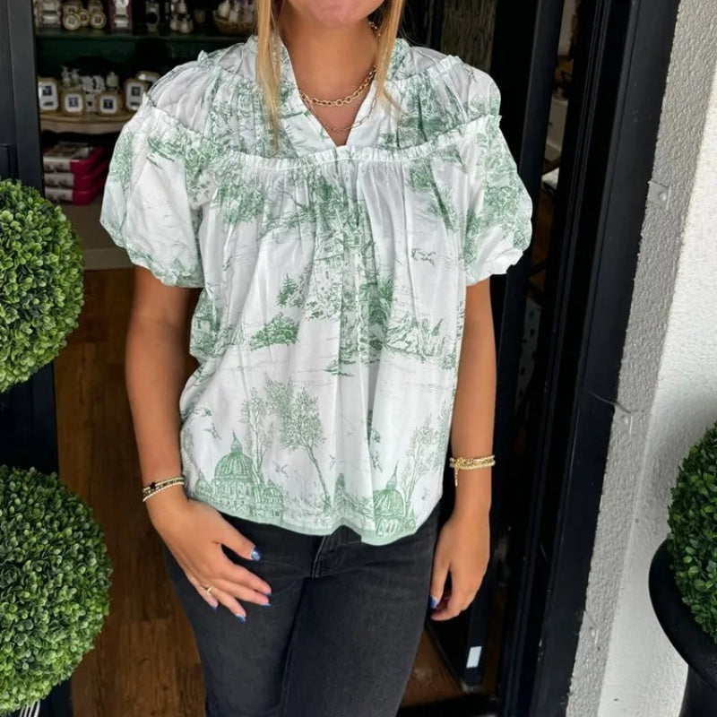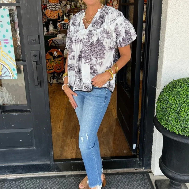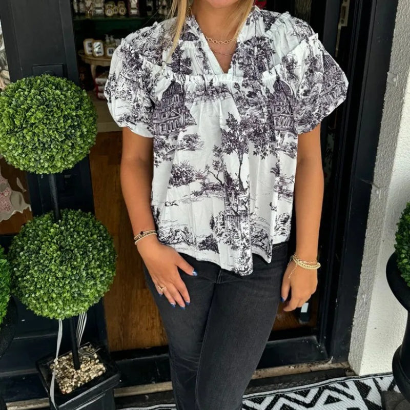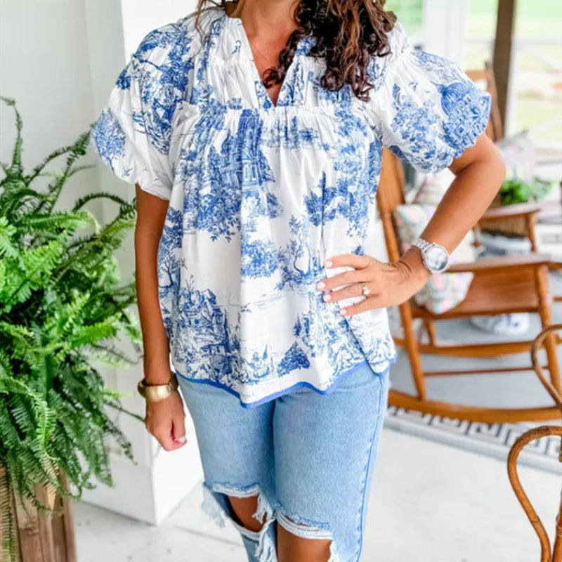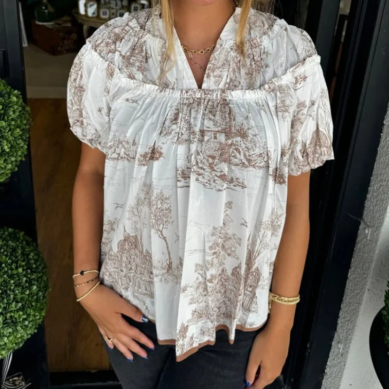 UNIKT TRYCK: Blusen har en konstnärlig touch och är perfekt att kombinera med olika underdelar som shorts, kjolar eller jeans för en snygg outfit.