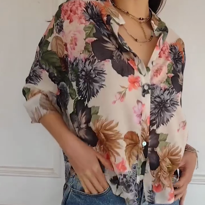V-ringad blus med blommigt tryck för kvinnor