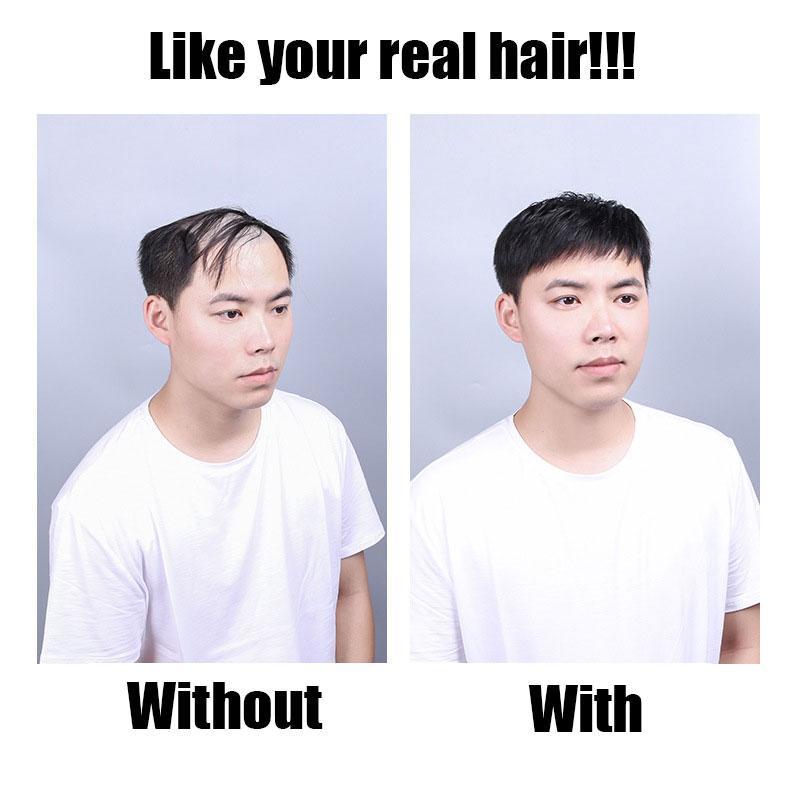 Vår peruk för manligt kal huvud är idealisk för män som lider av tunt hår, skallighet, håravfall eller bara vill ha en förändring i frisyren. Lätt och andningsbar, verklighetstrogen och naturlig, håret ser ut som naturlig tillväxt och är livfullt och mjukt.
