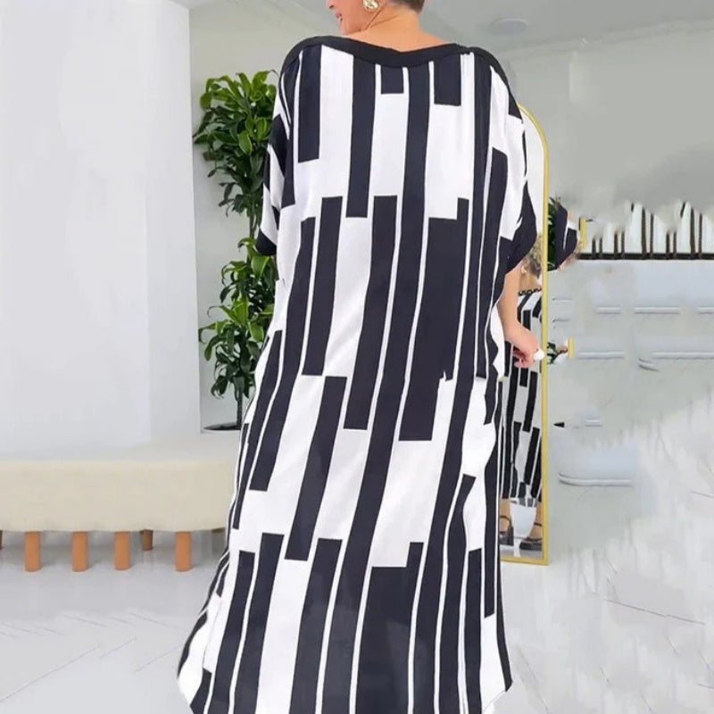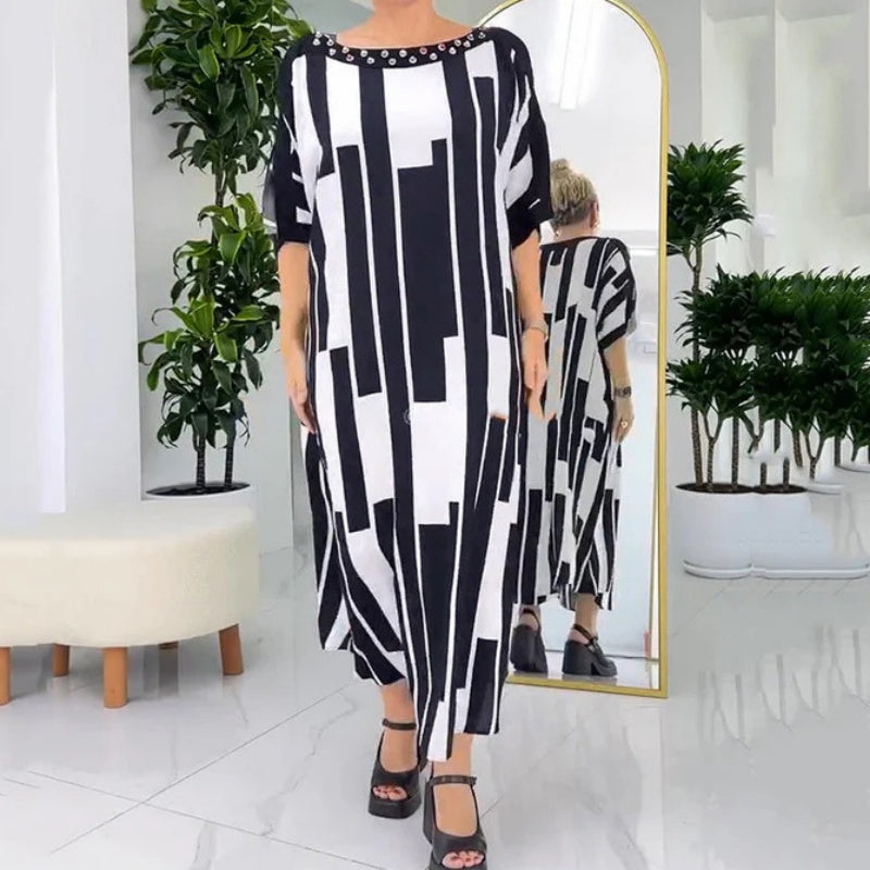 MODERN STIL â Den hĂ€r klĂ€nningen med ett elegant svartvitt tryck Ă€r ett djĂ€rvt modeuttalande och kombinerar tidlös elegans med en look som passar bĂ„de vardagliga och semi-formella tillfĂ€llen.