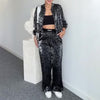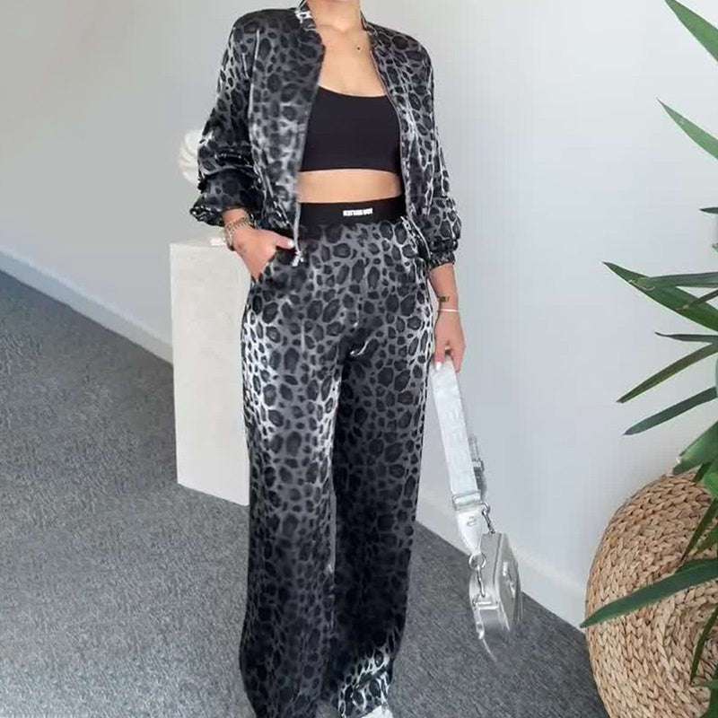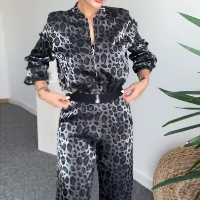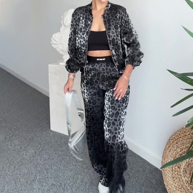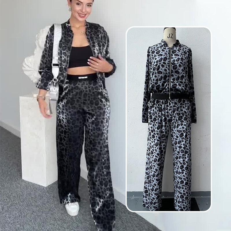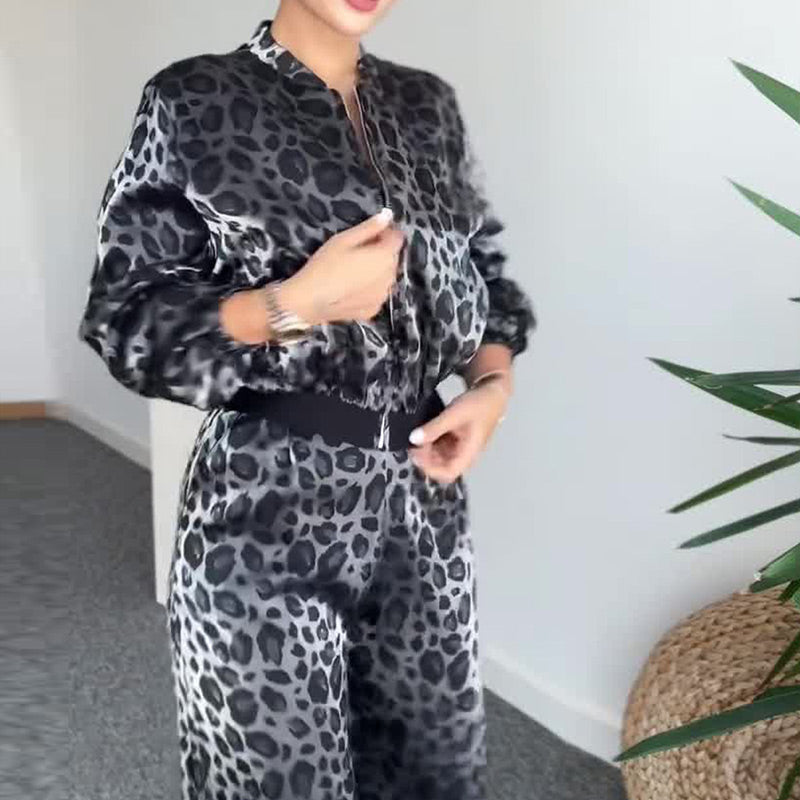 Tvådelat set med leopardtryck för dammode - Jacka med hel dragkedja och matchande byxor med vida ben