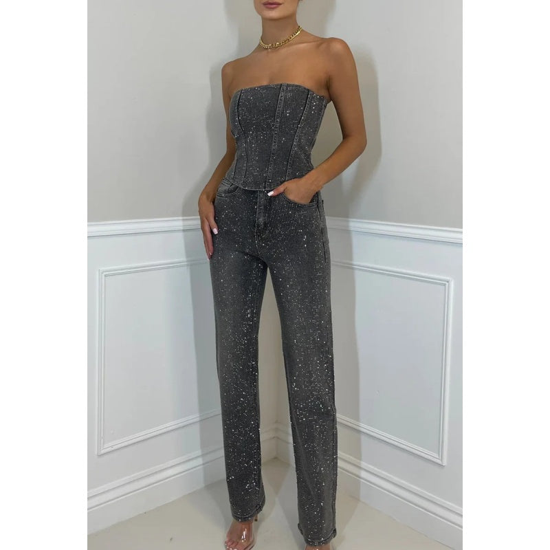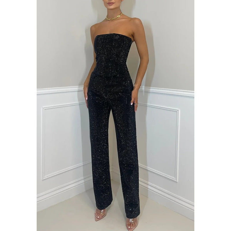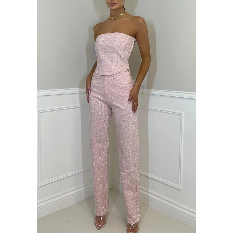 GLITTERGLAMOUR - Setet med topp och byxor är en fyrbåk av glittrande lockelse. Glitterdetaljerna skimrar, vilket gör det perfekt för fester och utekvällar, och ger en touch av elegans till varje ensemble med den där oförlikneliga glittriga charmen.