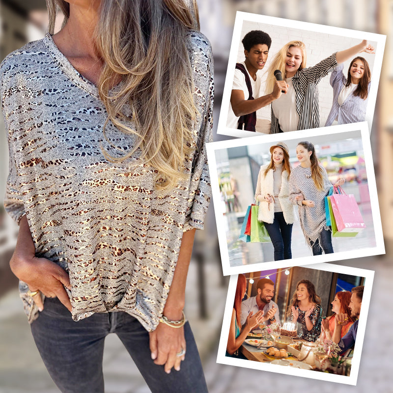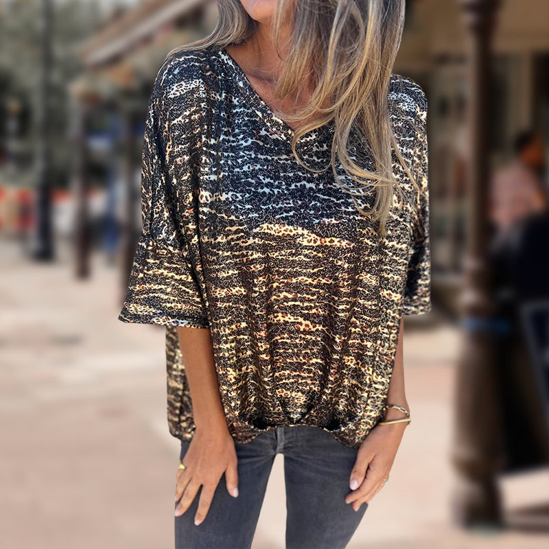 Detta snygga plagg har ett chict leopardtryck och en smickrande V-ringning, perfekt för en modern men bekväm look.