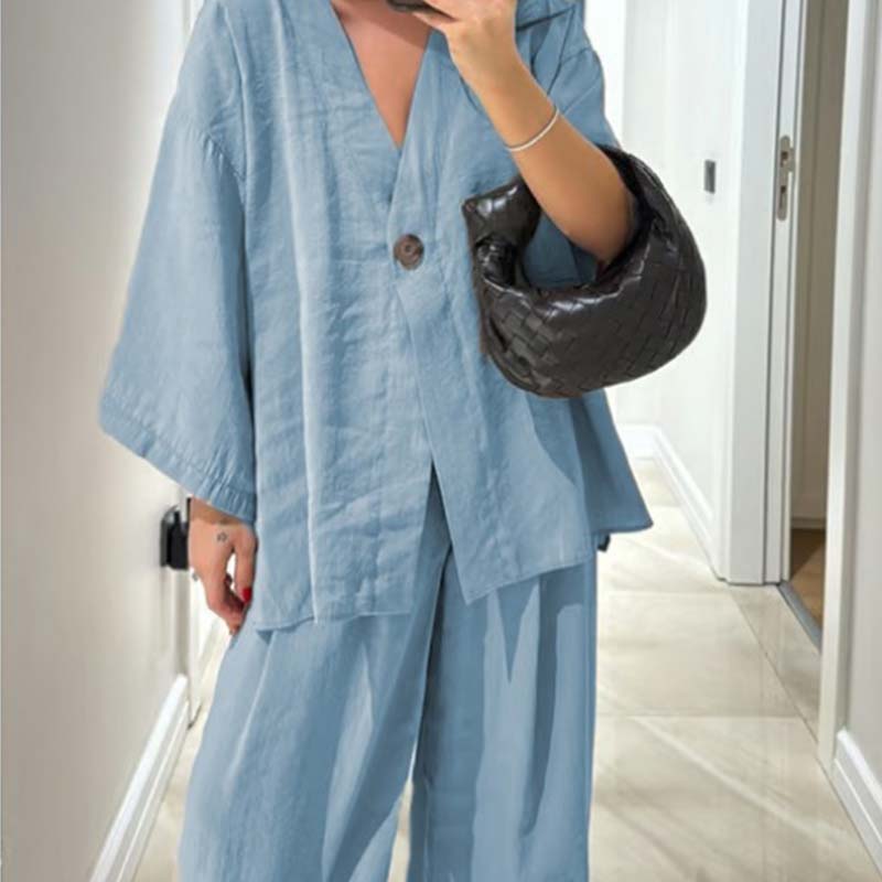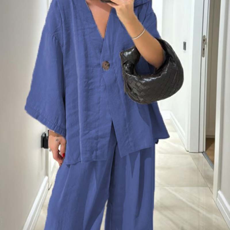 Tvådelat Enfärgat Set för Dam: Topp med V-ringning & Byxor med Vida Ben
