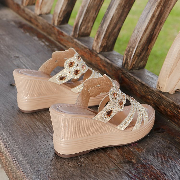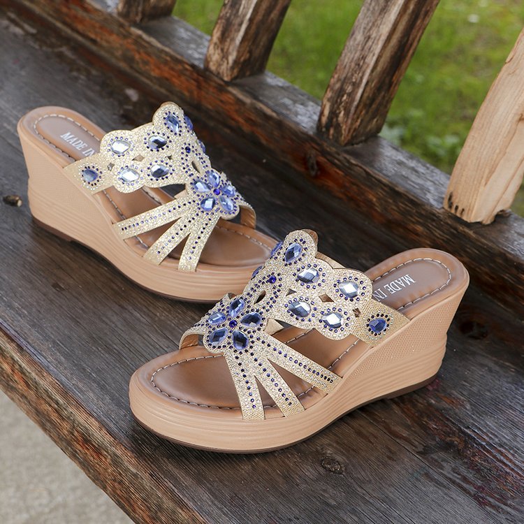 1 par damtofflor i bohemisk stil med öppen tå och paljetter