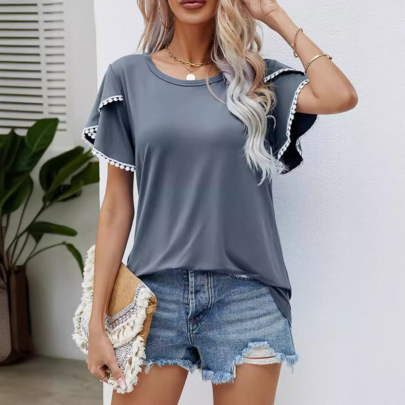 Casual T-shirt med rund hals och pom-pom-ärmar för kvinnor