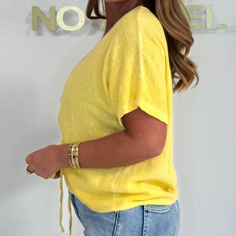 Kortärmad topp med dragsko fram och V-hals för kvinnor