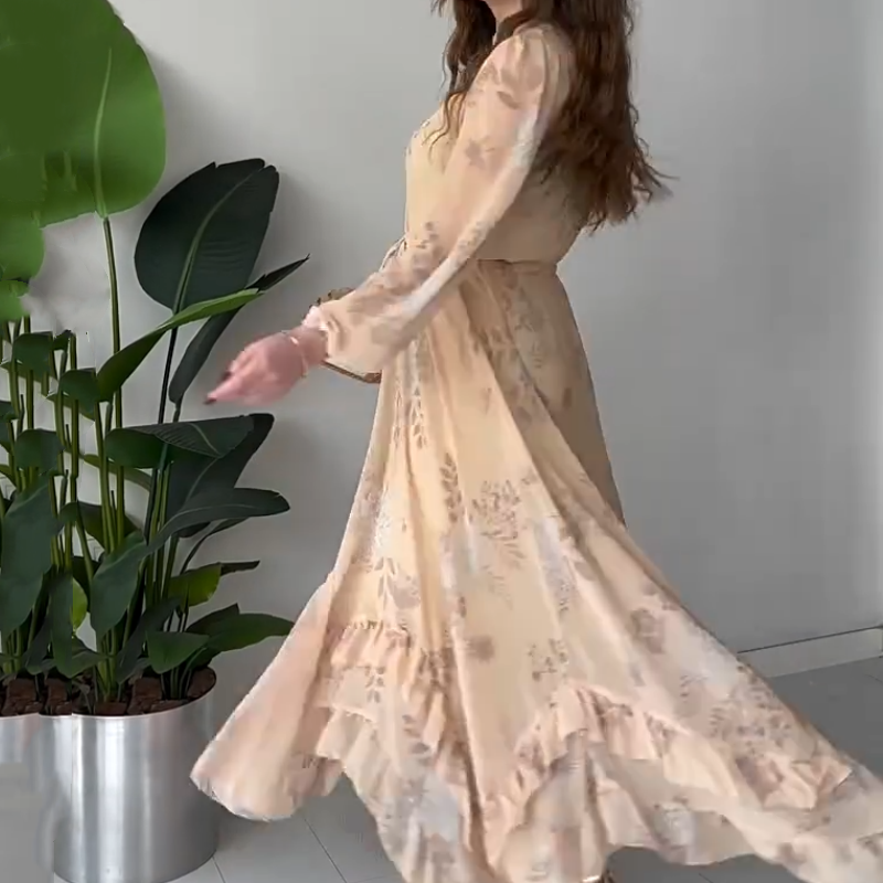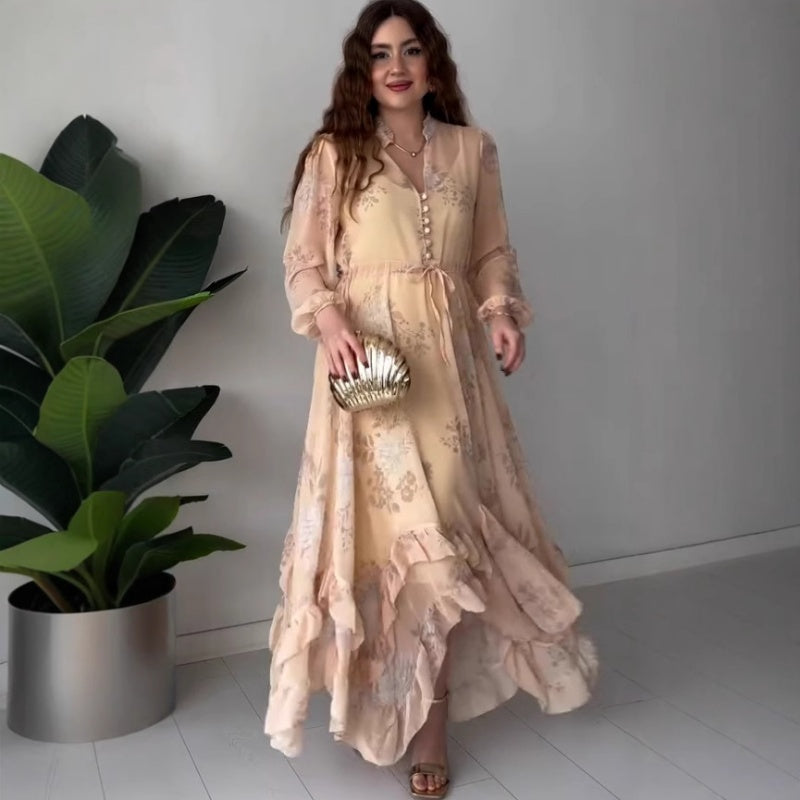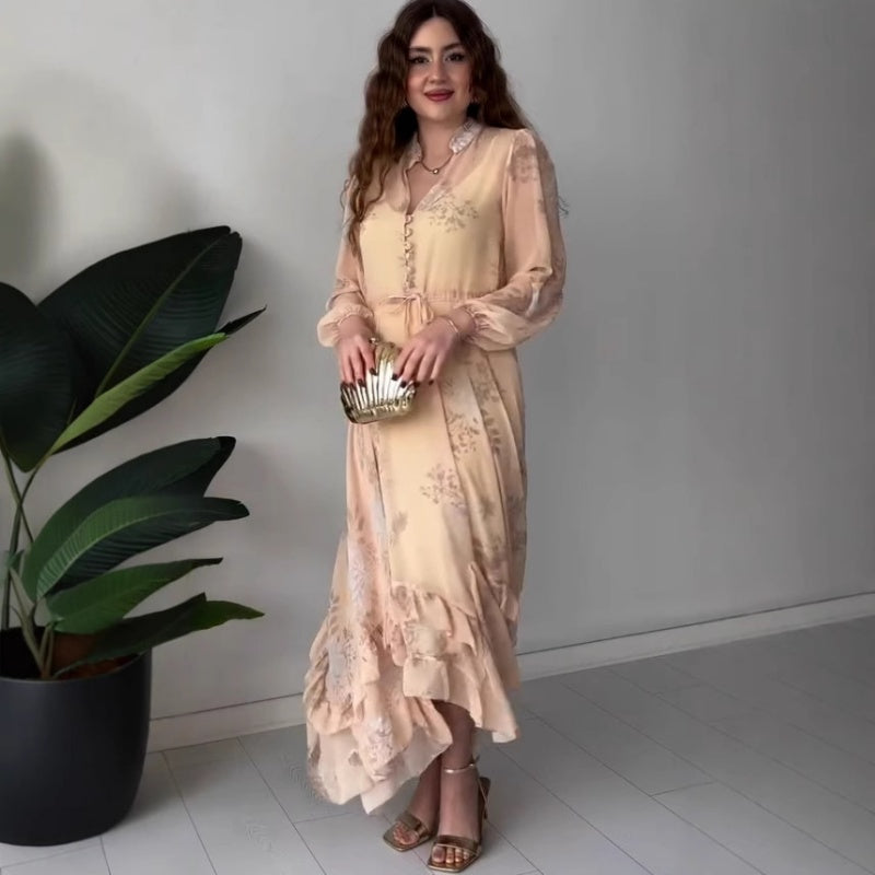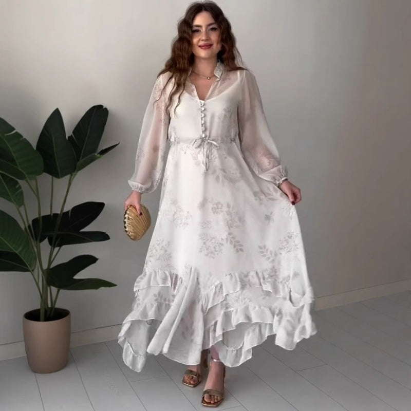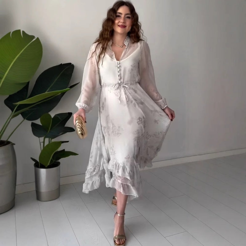 Elegant långärmad blommig klänning med snörning i mesh för kvinnor