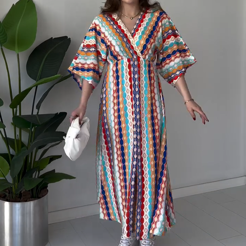 ⏰SISTDAY PROMOTION - 50%OFF💖Mångfärgad V-neck maxiklänning med tryck för kvinnor