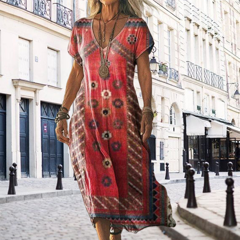 Kortärmad långklänning med tryckt V-nacke för kvinnor