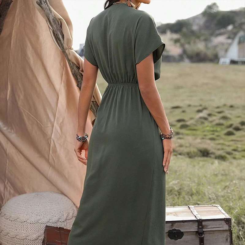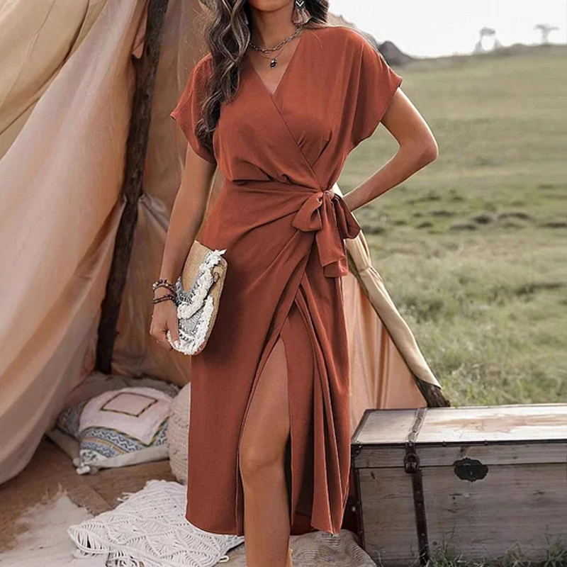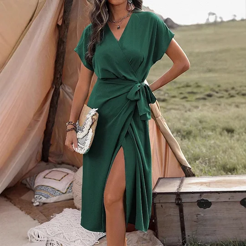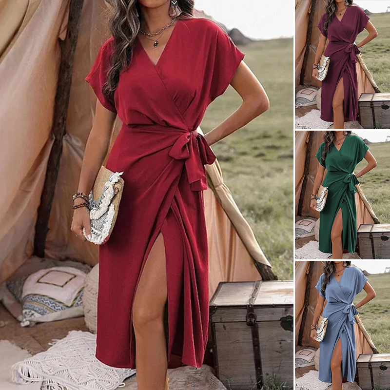 Enfärgad omlottklänning med knytband i midjan för kvinnor
