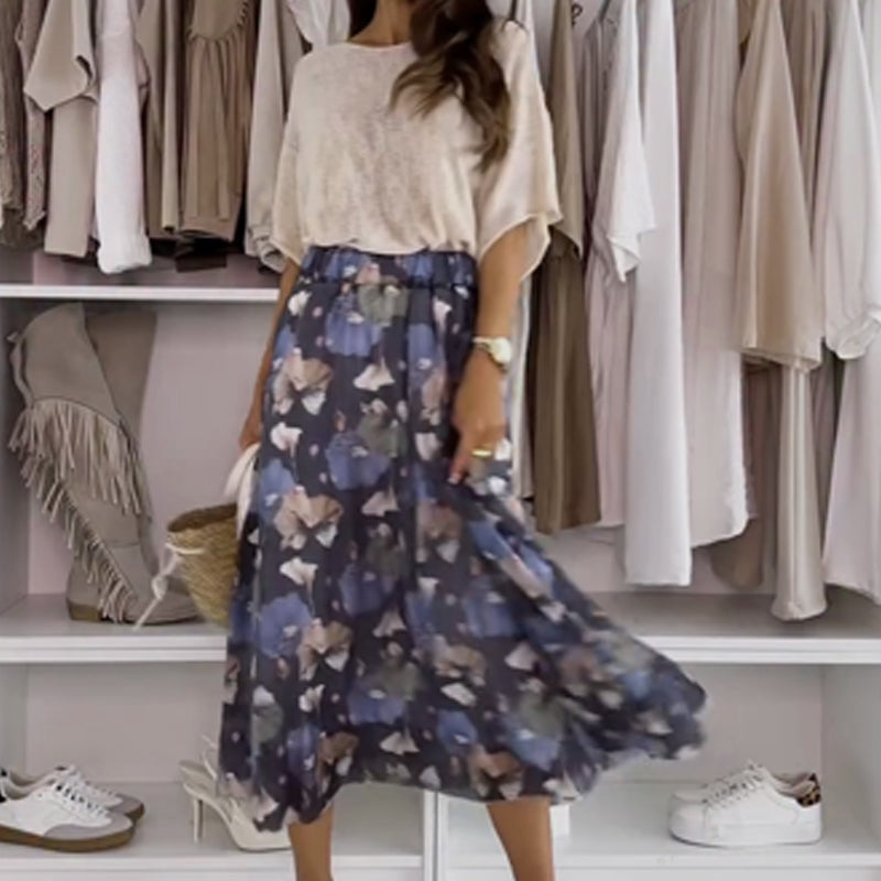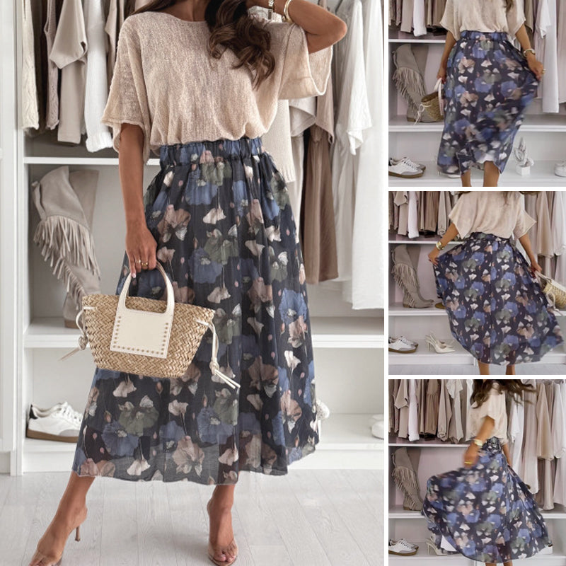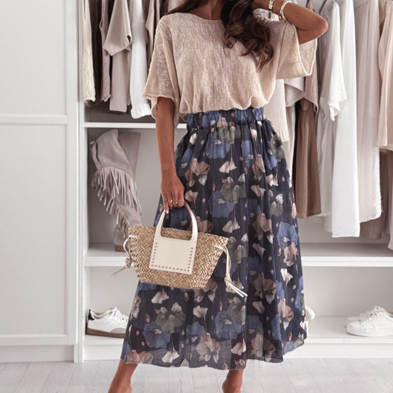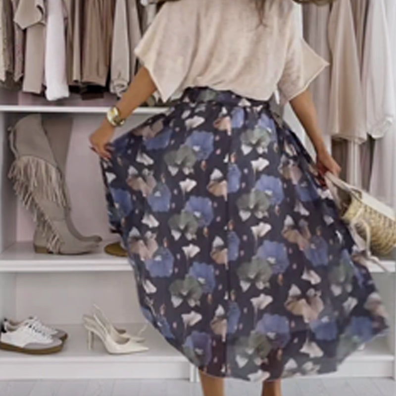 BLÅ TRYCKTA KJOL – Den halvlånga kjolen har en fräsch blå nyans med delikata tryckta mönster som ger en romantisk look. Den tillför en livfull visuell accent till din outfit och utstrålar elegant raffinemang.