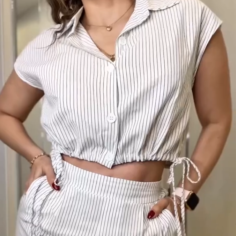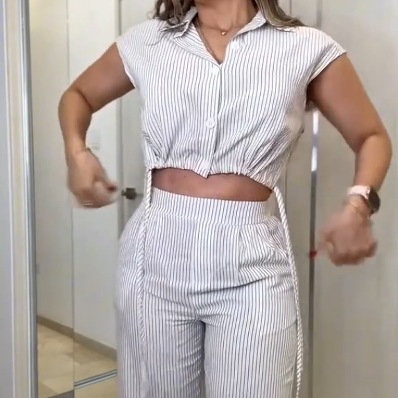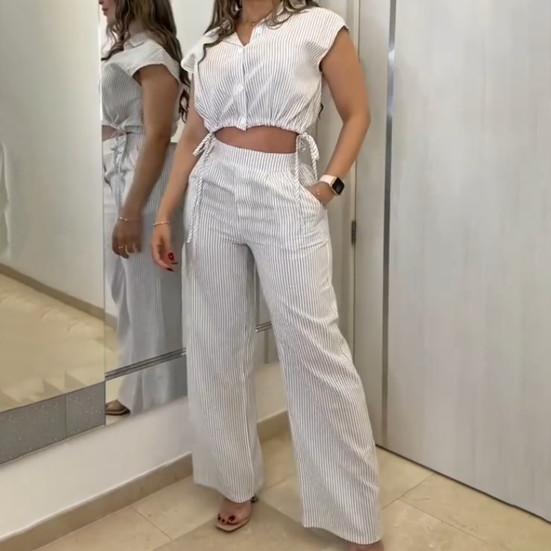 KLASSISK MATCHNINGSSET MED RANDIGA DETALJER - Detta matchande set i två delar har tidlösa randiga detaljer som ger en klassisk look som aldrig blir omodern. Den avslappnade men ändå polerade designen gör det enkelt att klä upp eller ner för alla tillfällen - brunch, resor eller avslappnade utflykter.